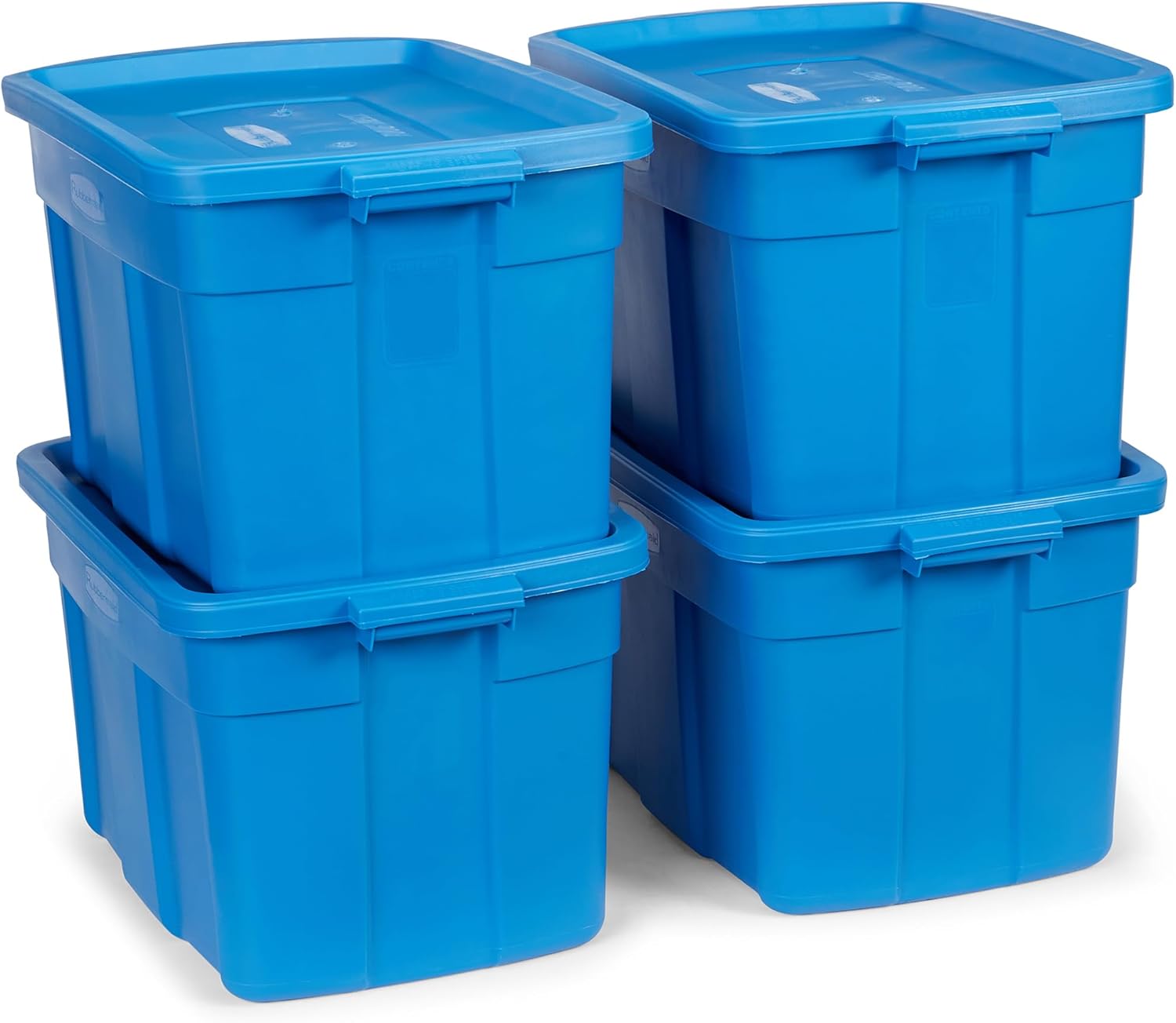 Rubbermaid Roughneck Tote 25 Gal, 4 Pack, Made in USA, Heritage Blue, Rugged Plastic Stackable Storage Bins with Lids and Handles