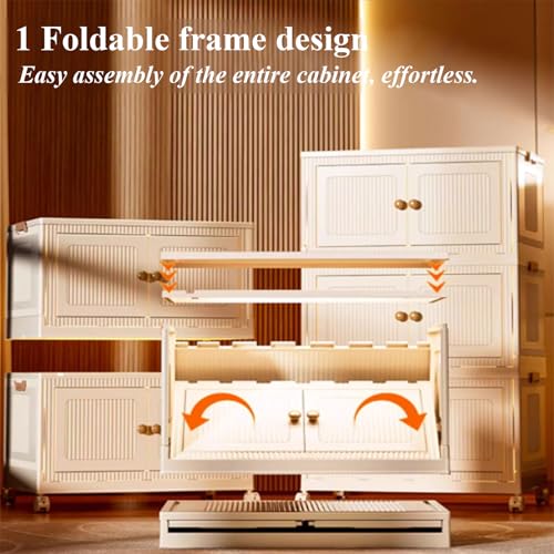 Folding storage cabinet with a one-piece folding frame design, saving time during installation. Compliant with mechanical structural design, strong load-bearing capacity, stable and not easily deformed. The side buckle is fixed, stacked firmly, and not easy to loosen or tilt.