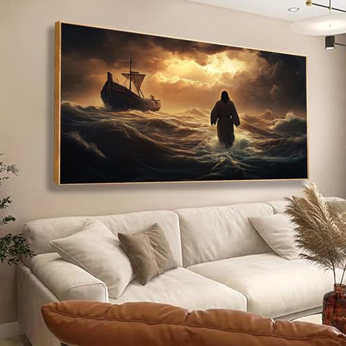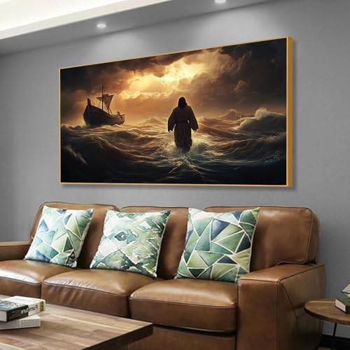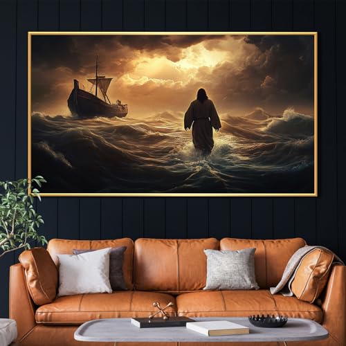 RUNBOAT Jesus Walking on Water Canvas Wall Art – Modern Christ Wall Decor for Living Room Bedroom (Black Framed, 59x33in|150x84cm)