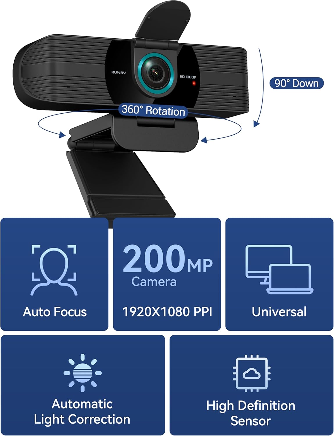 RUWBY Full HD 1080P Webcam with Built-in Dual Mics, Wide-Angle Lens, Privacy Cover, Tripod Stand, Autofocus Computer Camera, Plug and Play for Desktop PC or Laptop