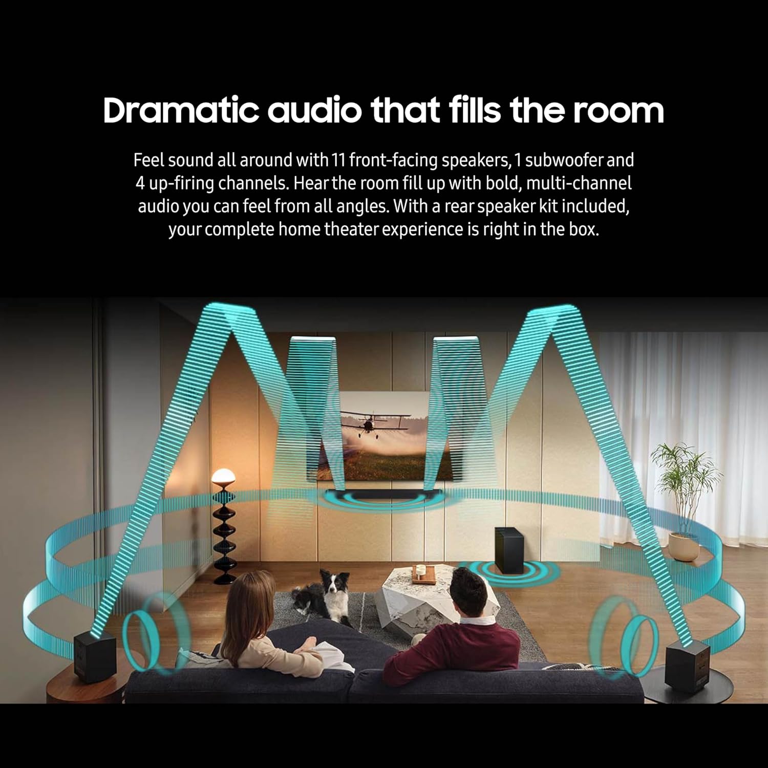 11.1.4 CH. TRUE DOLBY ATMOS SOUND: Feel sound all around with 11 front-facing speakers, 1 subwoofer and 4 up-firing channels; With a rear speaker kit included, your complete home theater experience is right in the box