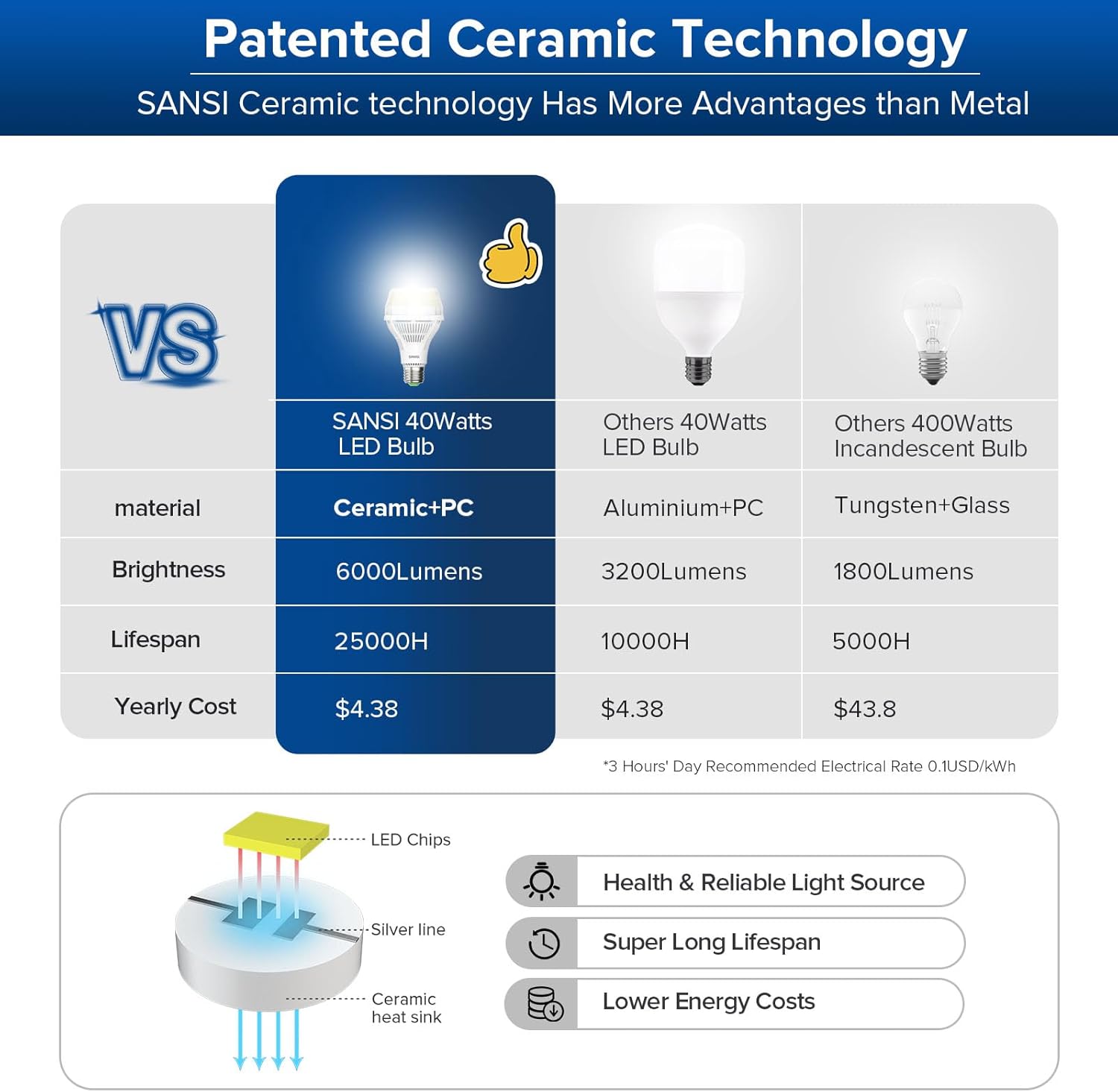 BRIGHT & EFFICIENT: Compared with other LED bulbs, SANSI’s highly efficient light bulbs can provide 6000 high lumens using only 40 watt of power, equivalent to 400W incandescent bulbs. Based on 3 hours per day usage, save up to 95% electricity, the annual estimated spend of 4.38