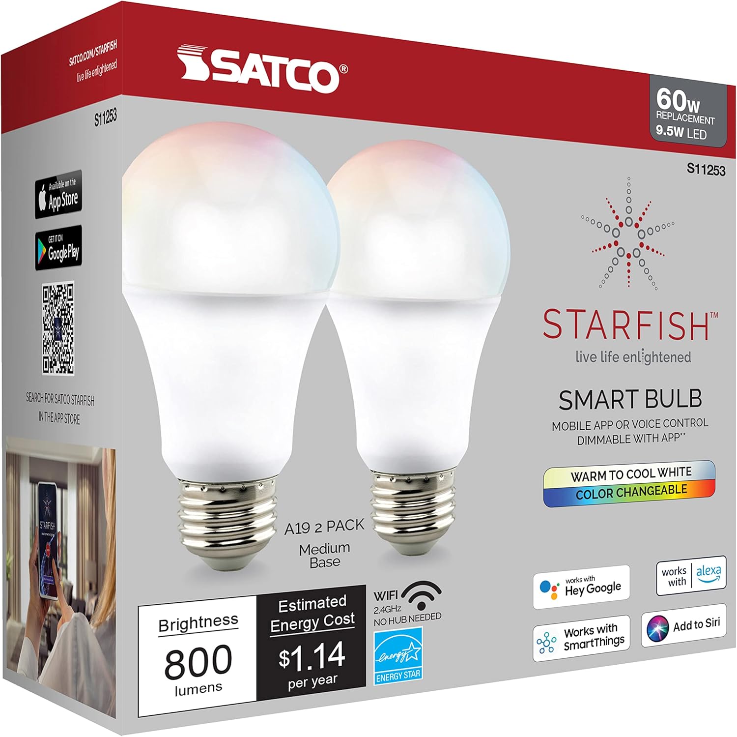 Satco S11253 Starfish 9.5-Watt A19 WiFi Smart LED Color-Changing Light Bulb, Works with Siri, Alexa, Google Assistant, SmartThings, 2700K-5000K, 800 Lumens, 2-Pack