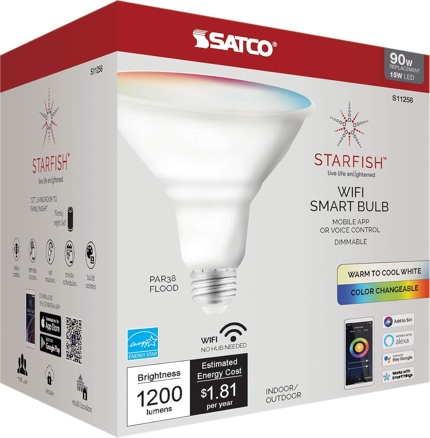 Satco S11258 Starfish 15-Watt WiFi Smart LED Light Bulb, Works with Siri, Alexa, Google Assistant, SmartThings, 2700K-5000K, PAR38, 1200 Lumens, White