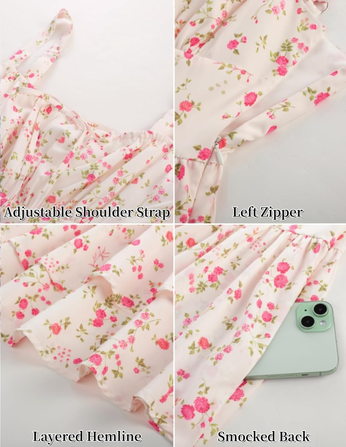 The video showcases the product in use.The video guides you through product setup.The video compares multiple products.The video shows the product being unpacked. Floral Mini Dress Merchant Video