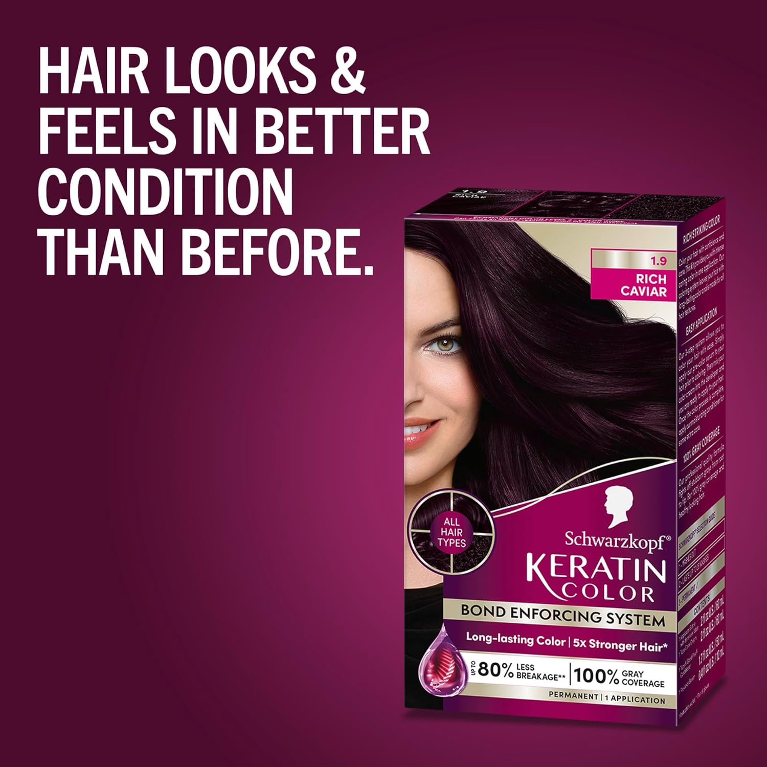 Schwarzkopf Keratin Permanent Hair Dye Cream, 1.9 Rich Caviar, Professional Quality Color for Up to 100% Gray Coverage, Bond Enforcing System