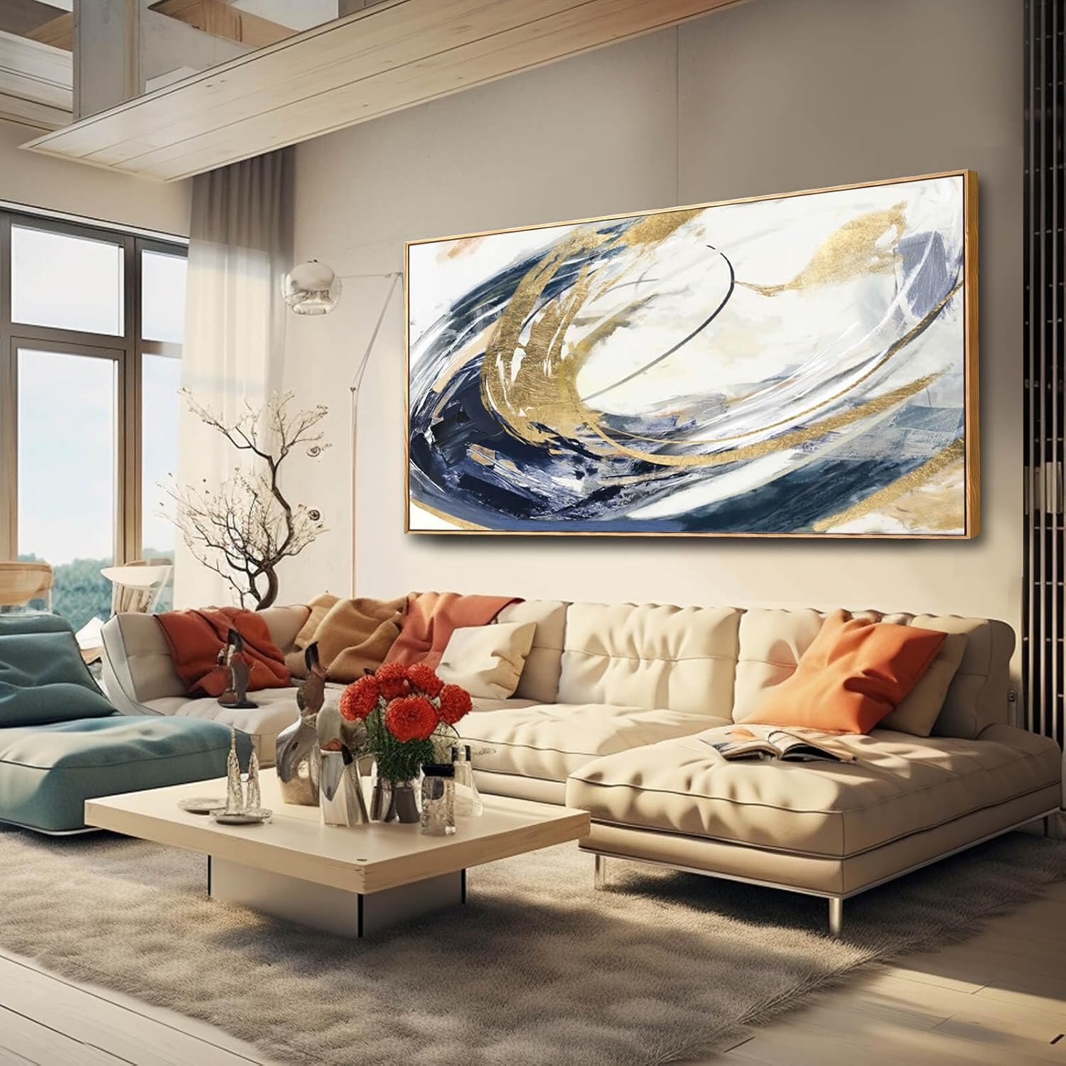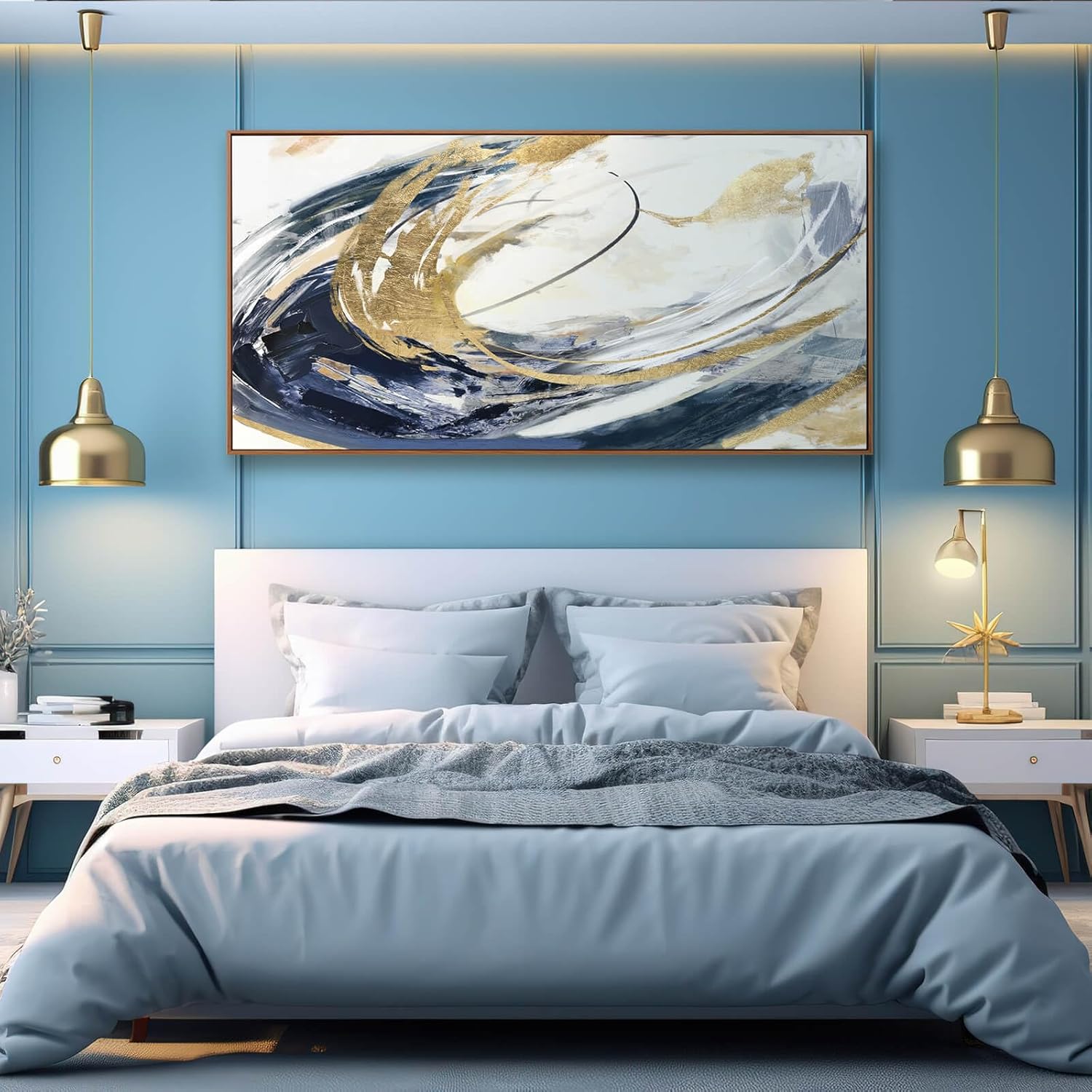 SDYA Large Artwork Abstract Painting 30″x 60″Gold Wall Decor Abstract Wall Art for Living Room Blue Artwork for Bedroom Kitchen Home Wall Decor