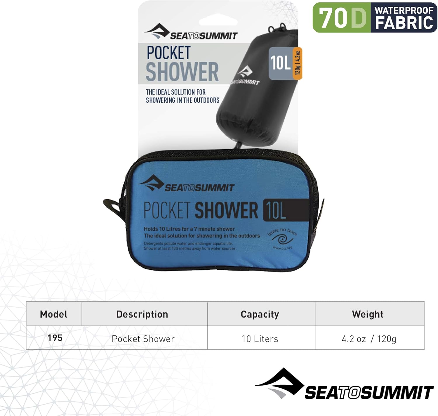 10-liter pocket shower provides a 7-minute shower; ideal for backpacking, camping, bike touring, and travel