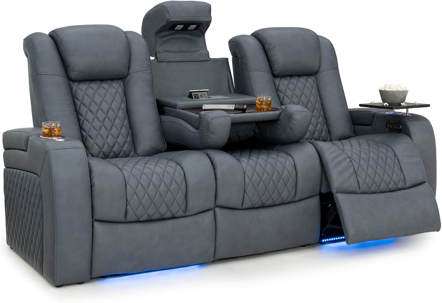 Seatcraft Anthem Italian Leather Sofa w/Fold-Down Table, Living Room, Power Headrest, Power Recline, Smokey Blue