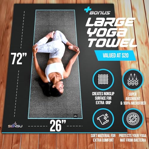 Create Your Sacred Workout Space – Move freely and comfortably on any hard surface with the Sensu hot yoga mat! At 9′ x 6′ and 9mm thick, it transforms any area into a supportive space for yoga, stretching, or fitness. Comes complete with a waterproof carry bag, sticky mat grips, and a large microfiber towel for versatile use anywhere.