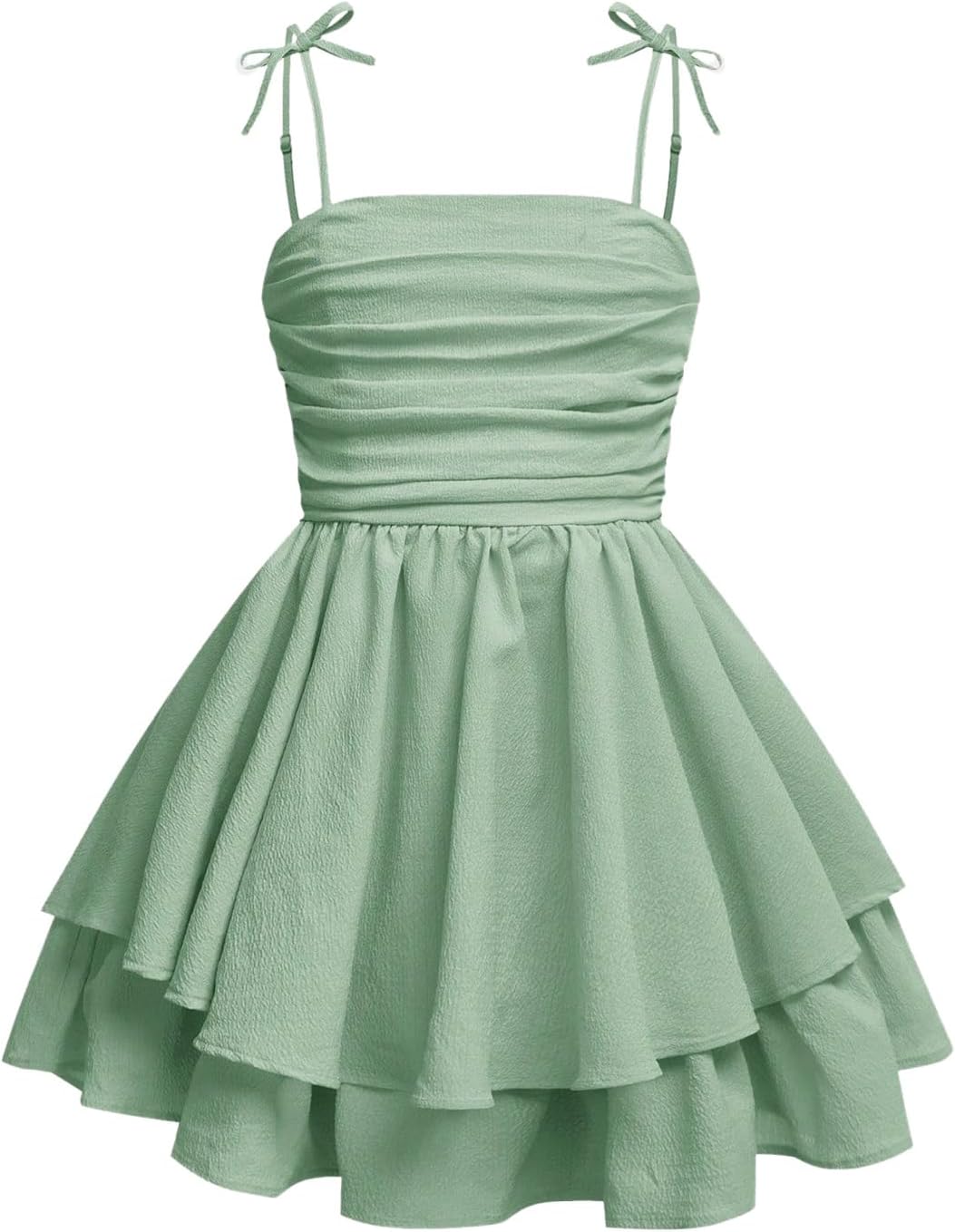 SHENHE Girl’s Smocked Ruched A Line Swing Dress Layered Tie Shoulder Flowy Cami Short Dress