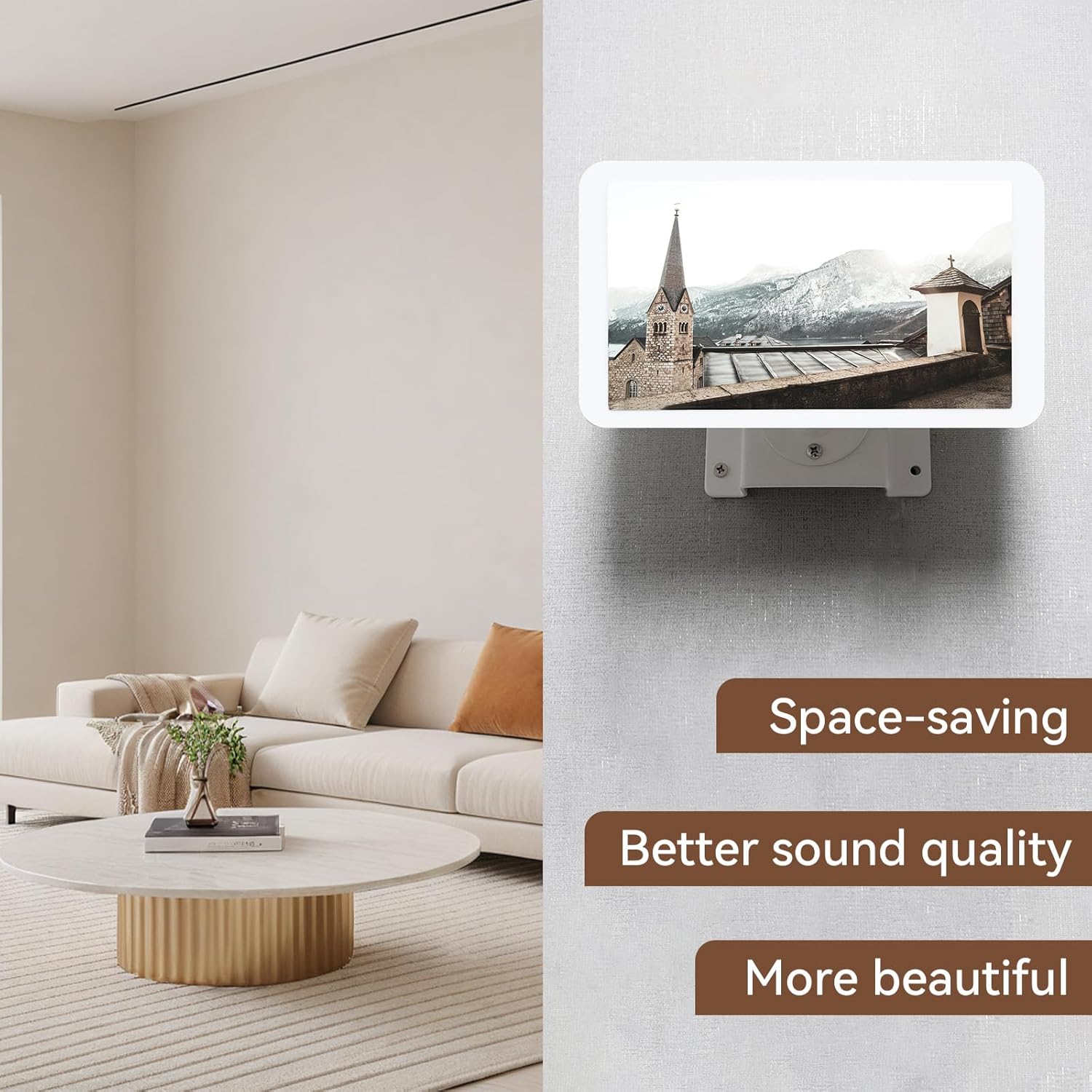 Easy to use, you can move the Wall mount anywhere and enhance your smart home experience. It can be used in the kitchen, study, living room, bathroom, bedroom and office. It helps you to free up space on your desk, gives your Echo Hub a nicer, more aesthetic look and prevents coffee, cola or water from harming you.