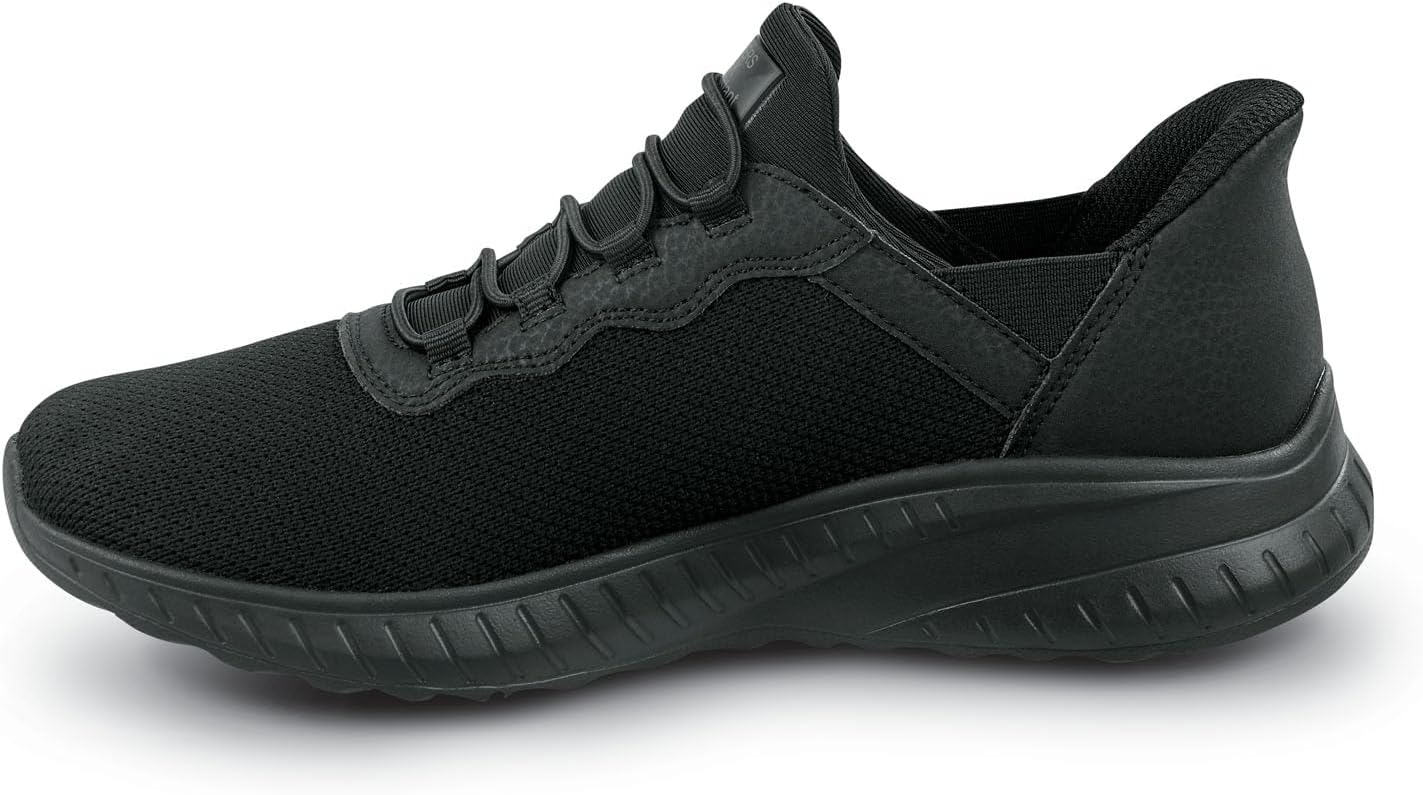 Textile, mesh and synthetic upper with stretch laces. Skechers Air-Cooled Memory Foam cushioned comfort insole. Bungee construction. Skechers Hands Free Slip-Ins molded heel panel for an easy fit. Machine washable. 1 1/4-inch heel height. No tie fit. . SR Max MaxTRAX patented oil and slip resistant rubber outsole. Soft toe. No safety toe cap. EH. ASTM F2892-24 EH SRO compliant.