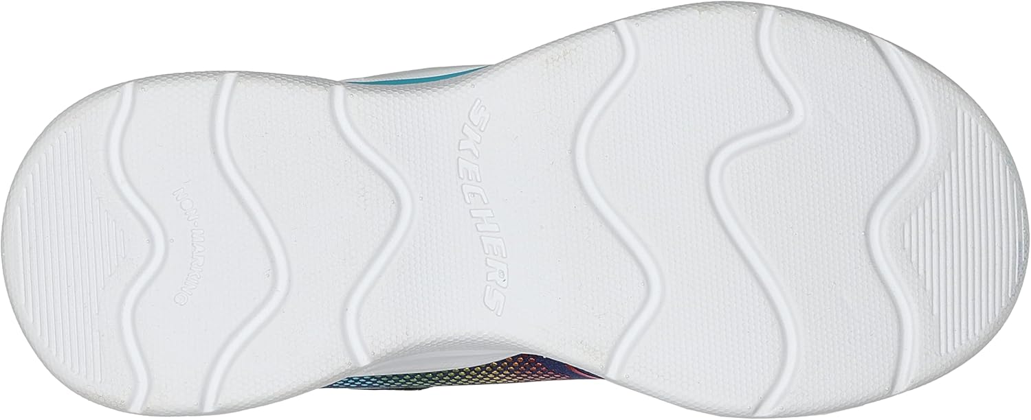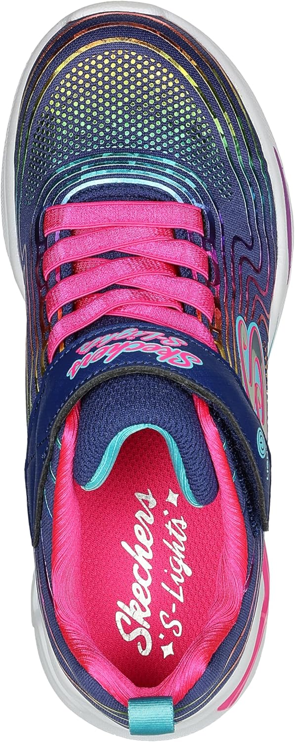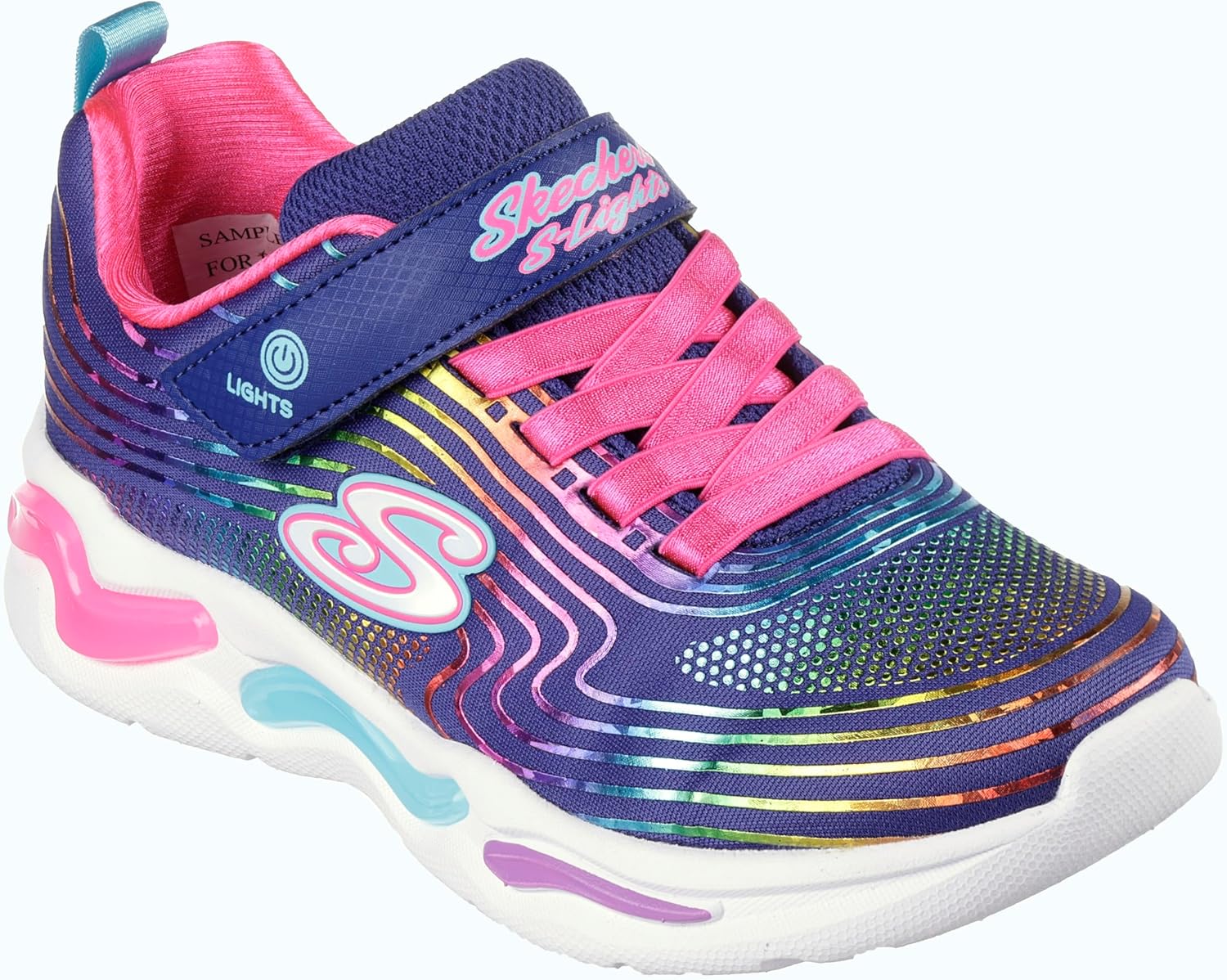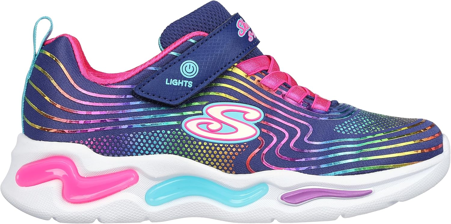 Step into fun with these eye-catching S Lights Wavy Beams Light Up Sneakers. Perfect for kids who want to make a statement, these toddler shoes feature a stunning rainbow foil and mesh upper design with a colorful light-up midsole that brings excitement to every step. The slip-on style with gore strap ensures easy wear while the cushioned comfort insole provides all-day support. These shoes combine style and functionality with an on/off light button feature and flexible traction outsole for secure steps.