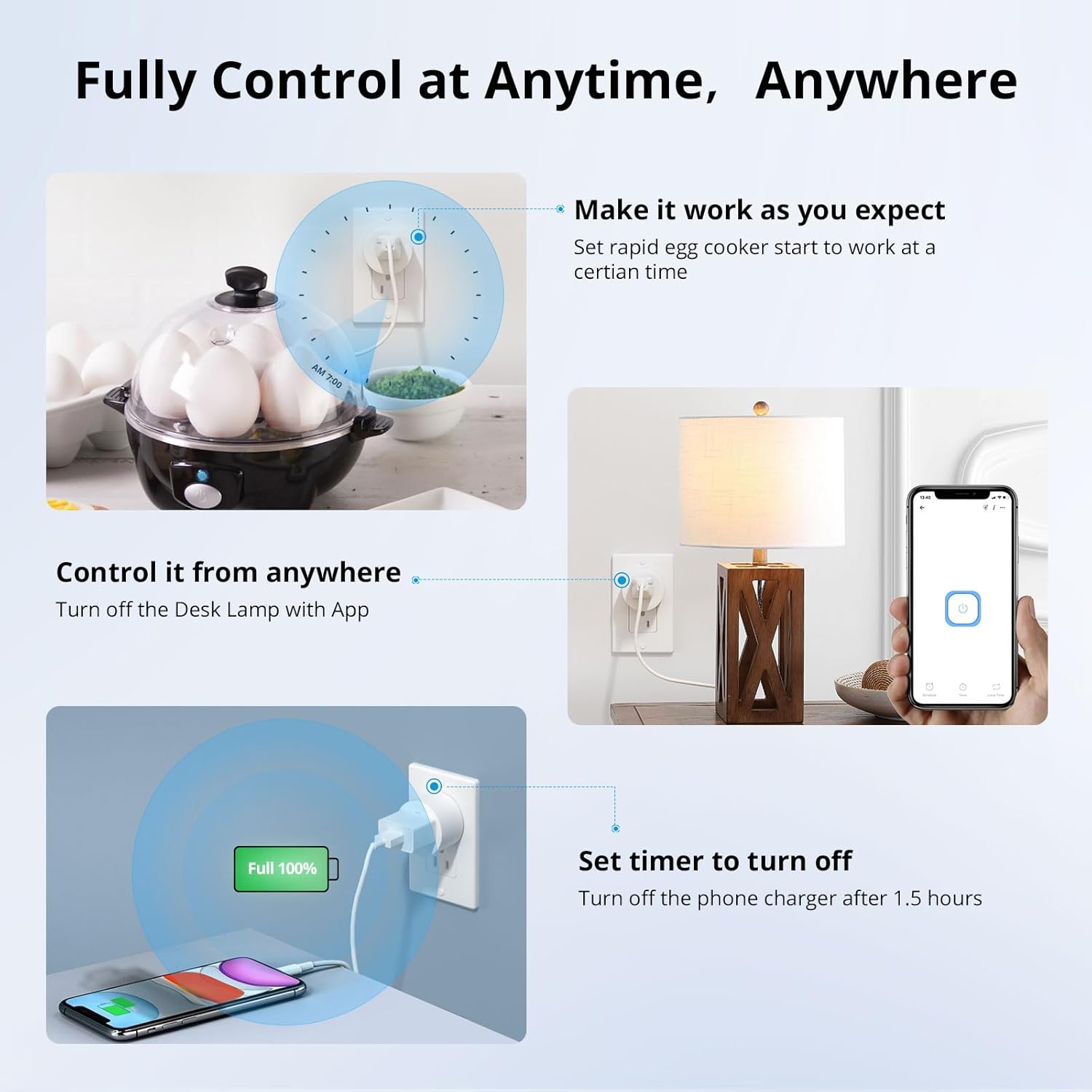 Multiple Safeguards & Small Size: With FCC certified, the quality of smart plug is assessed. Our product is rated: 10A, 1200W and support 120V. Compact and flexible design can save space, smart home plugs fit for every corner of your room.