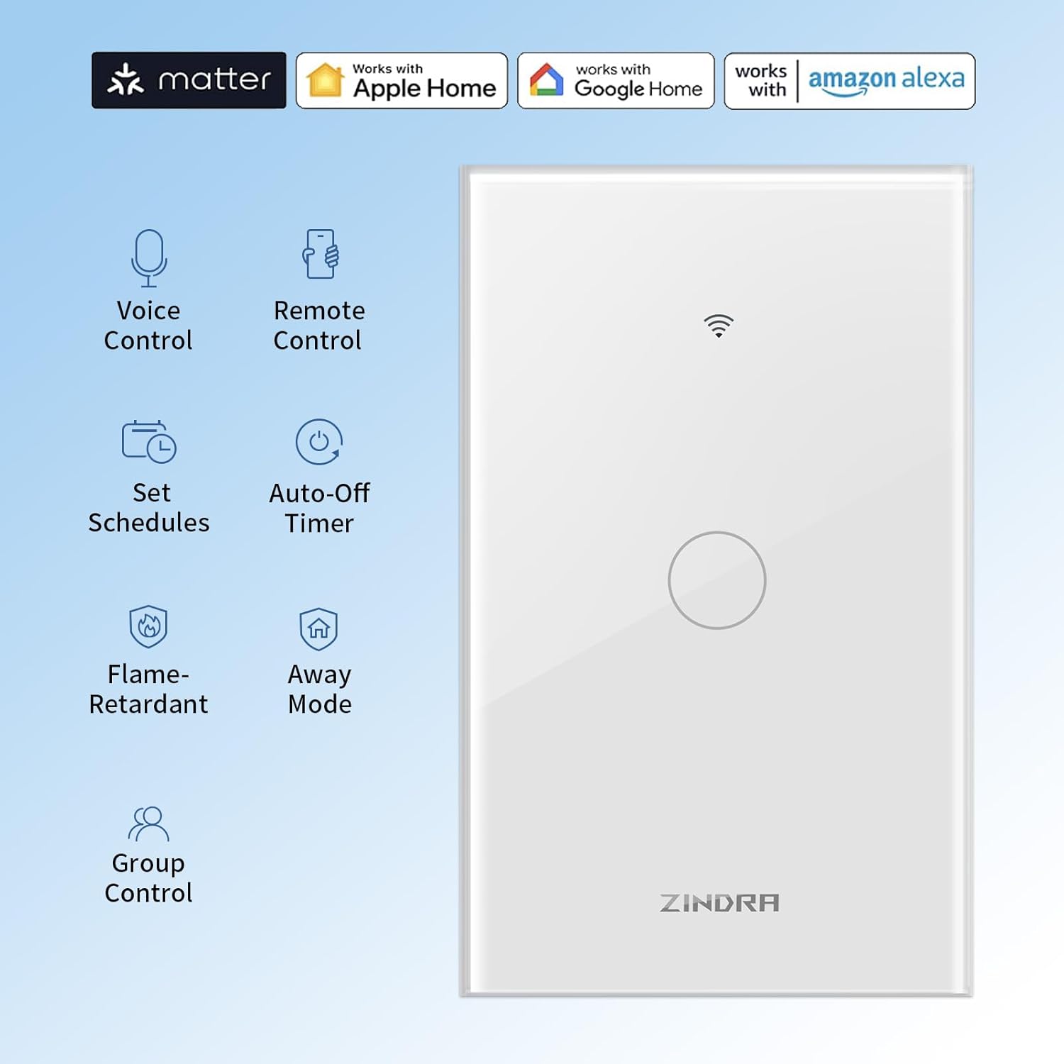 Smart Touch Wall Light Switch with Matter, Tempered-Glass Panel, Neutral Wire Required, Single-Pole, 2.4GHz Wi-Fi, App/Voice Control with Alexa/Google/Apple Home, Timers & Schedules – 1 Gang 120x72mm