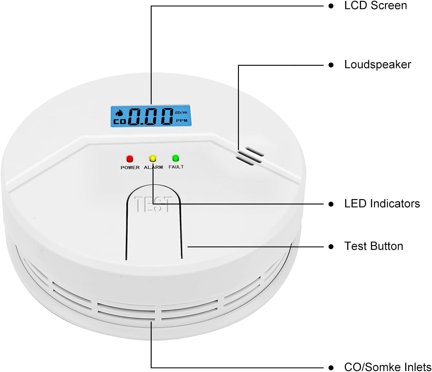 Test Button:To ensure the proper functioning of our detector, we have included a convenient test button. Regularly testing your detector is crucial to maintain its effectiveness