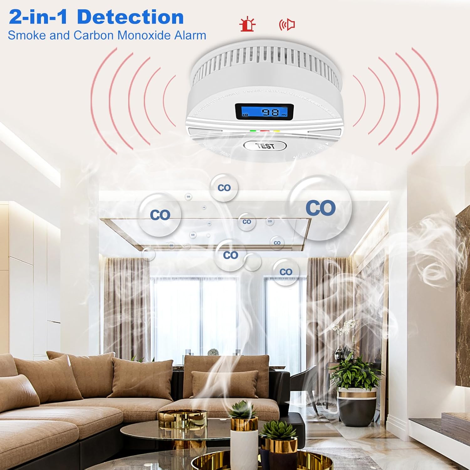 Specification: Smoke and Carbon Monoxide Detector with Batteries,2-in-1 Smoke Detector Carbon Monoxide Detector Combo,Smoke and Carbon Monoxide Alarm with Test Button and Digital Display