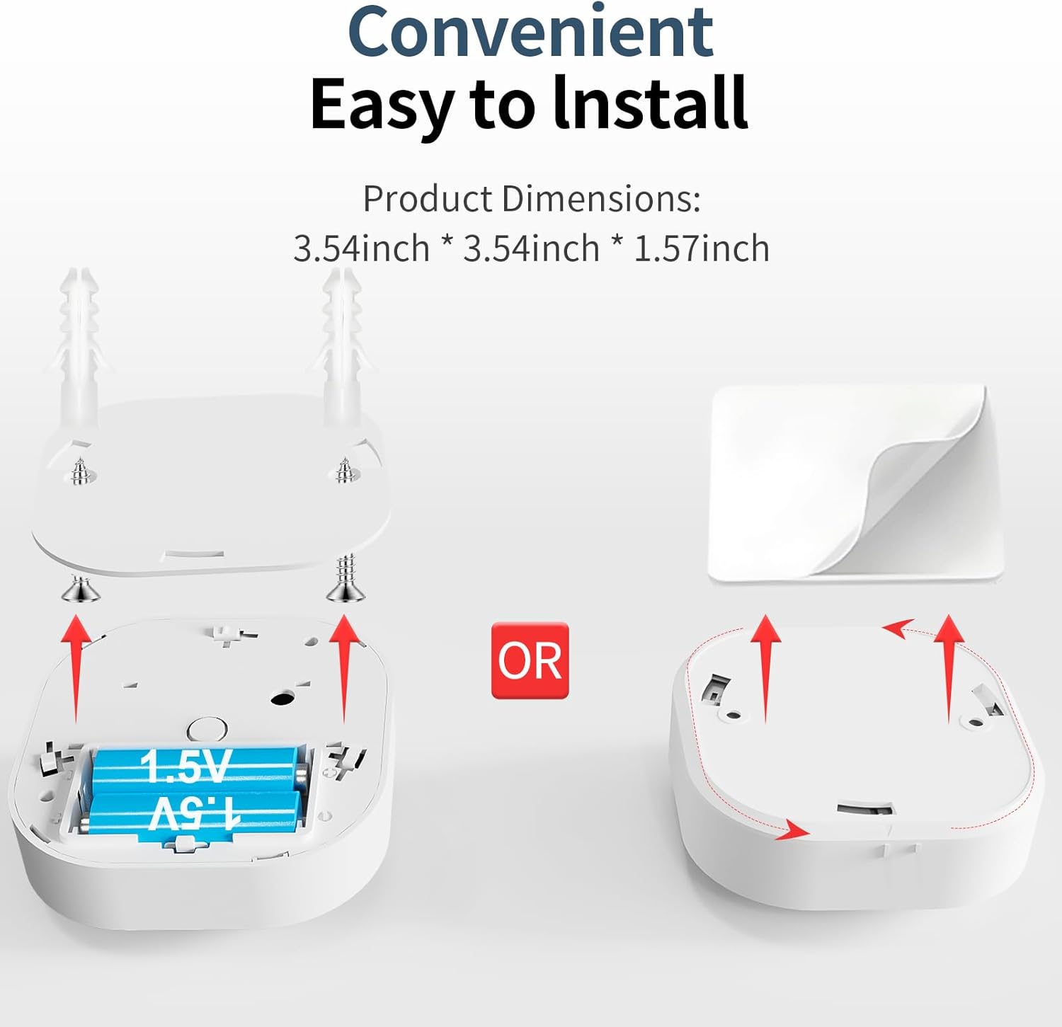 【Easy Setup】Installation is simple and tool-free: just detach the backplate, mount using screws or adhesive tape (both included), and insert batteries. With clear visual indicators—red LED flashes every 60 seconds in standby, blinks rapidly in silence mode, and flashes every 55 seconds with a beep for low battery—anyone can easily understand the device status, making it senior and beginner-friendly.