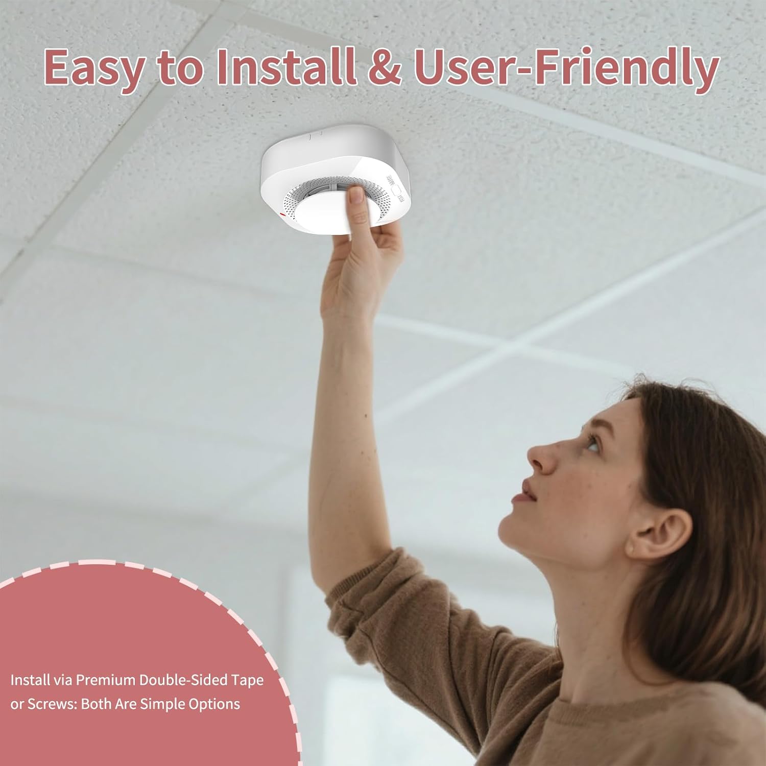 【Design for Safety & Convenience】Features a dedicated test button for regular function checks and a silence mode with safety reminders to prevent misuse. Everything needed is included—detector, backplate, screws, anchors, and adhesive tape—so you can install and use it right out of the box.