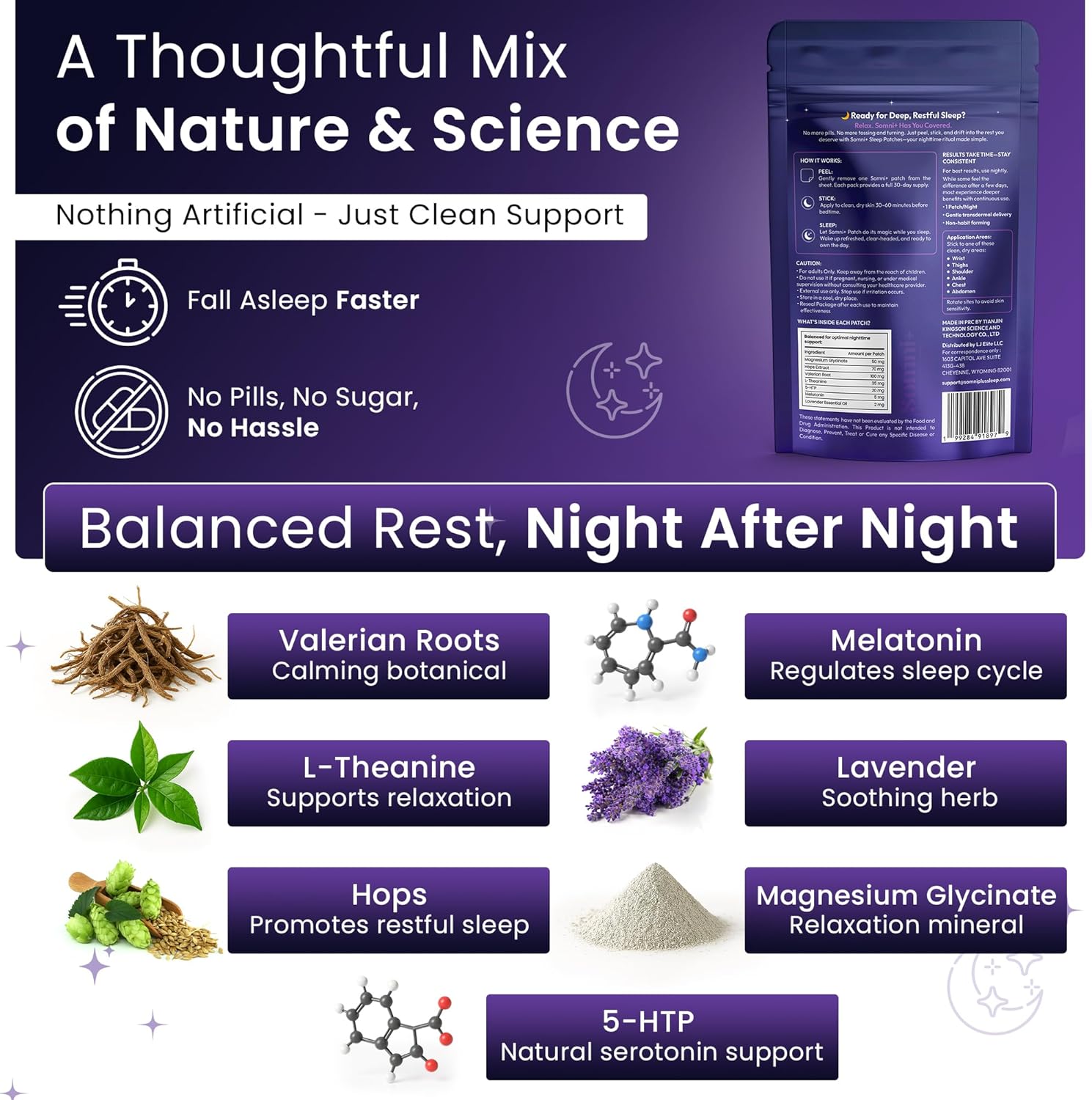 Botanical sleep patch with melatonin and calming ingredients: Features 5 mg melatonin combined with valerian root, lavender, hops, 5-HTP, and magnesium; supports a smooth bedtime routine; a thoughtful choice for adults who prefer botanical-based options