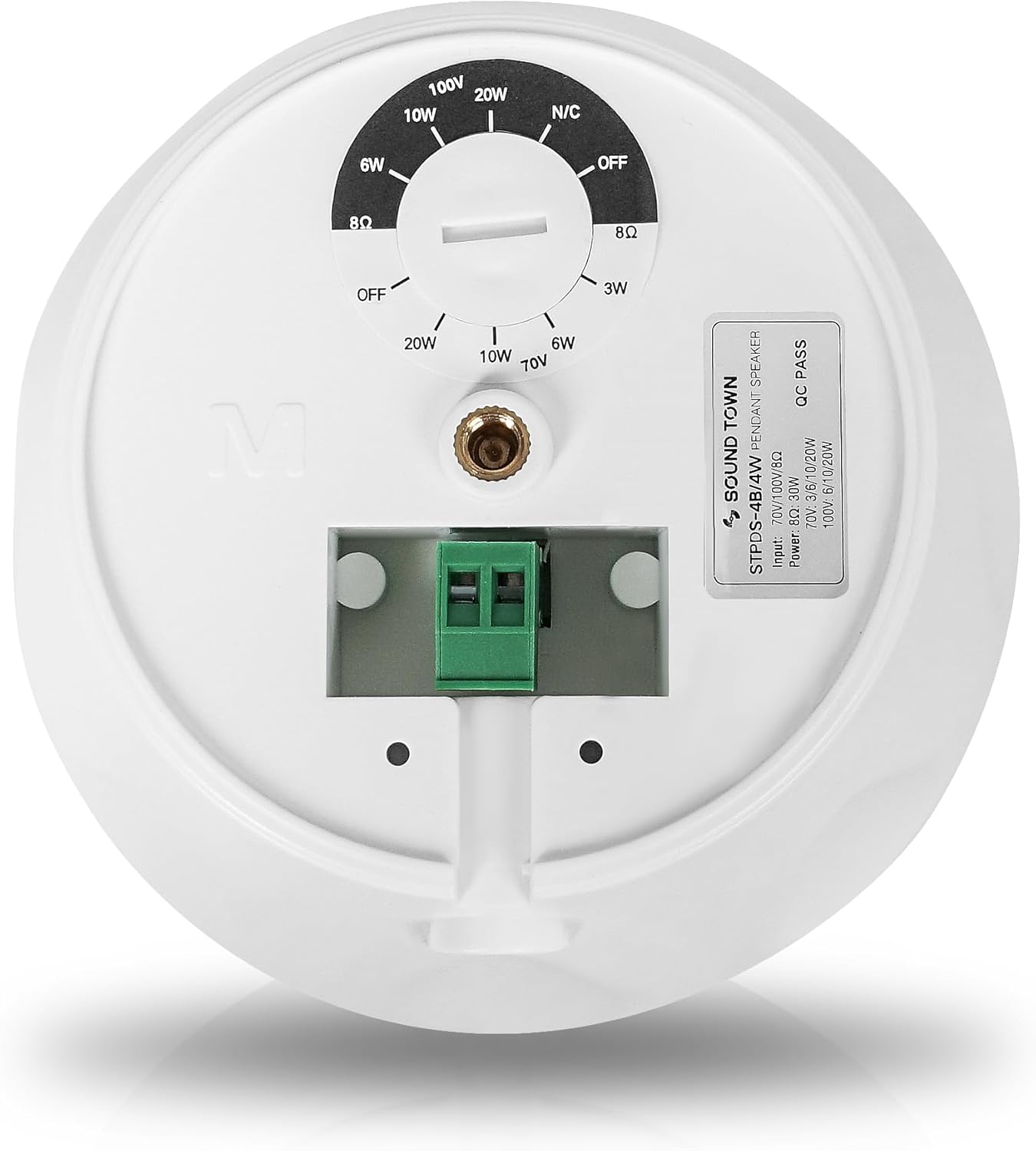EASY SET UP AND INTEGRATION: Easily add the STPDS-4W pendant speakers with the built-in step-down transformer and taps, making them a breeze to integrate into 70V or 100V commercial speaker setups using the included PAC80-2 amplifier