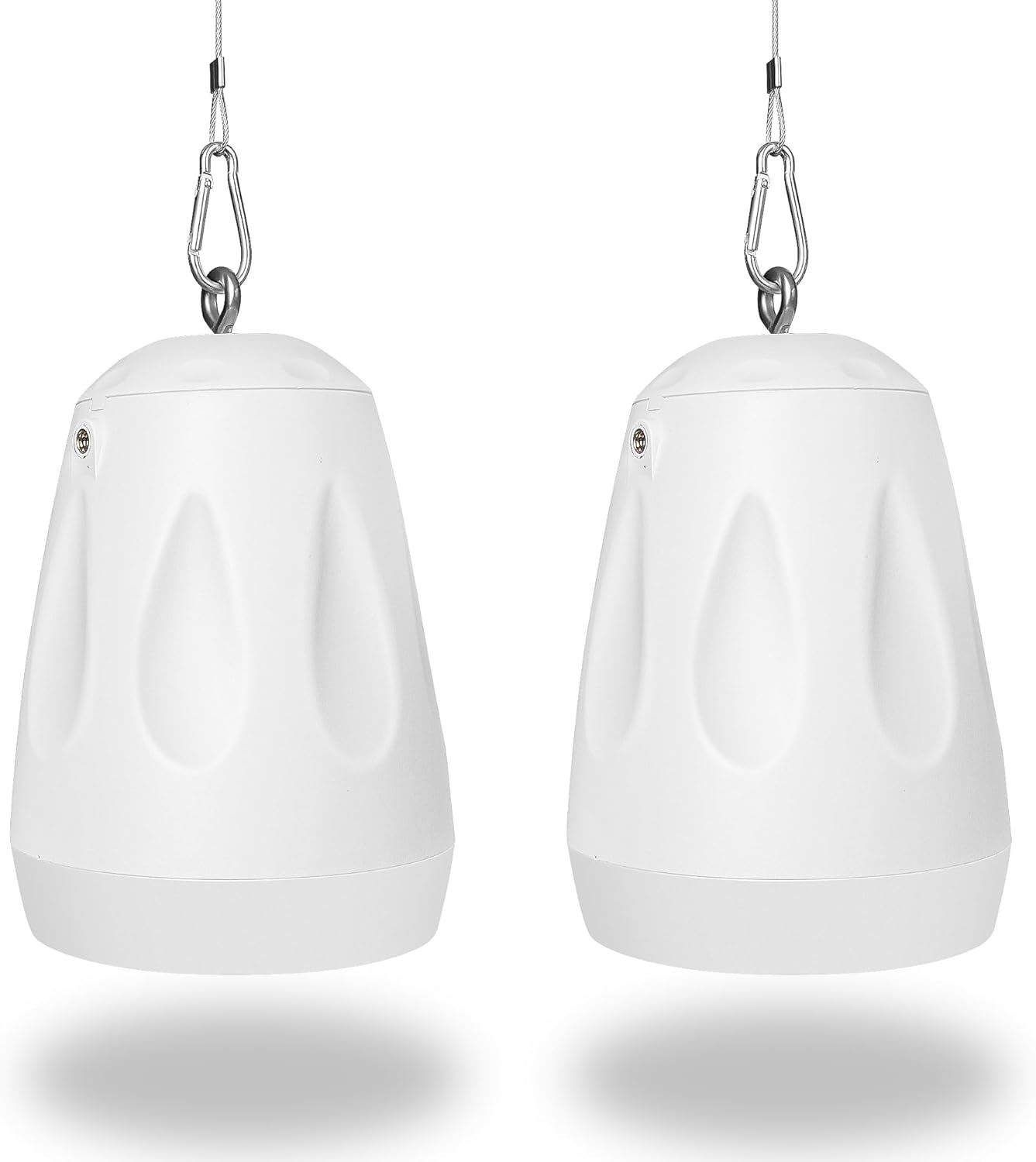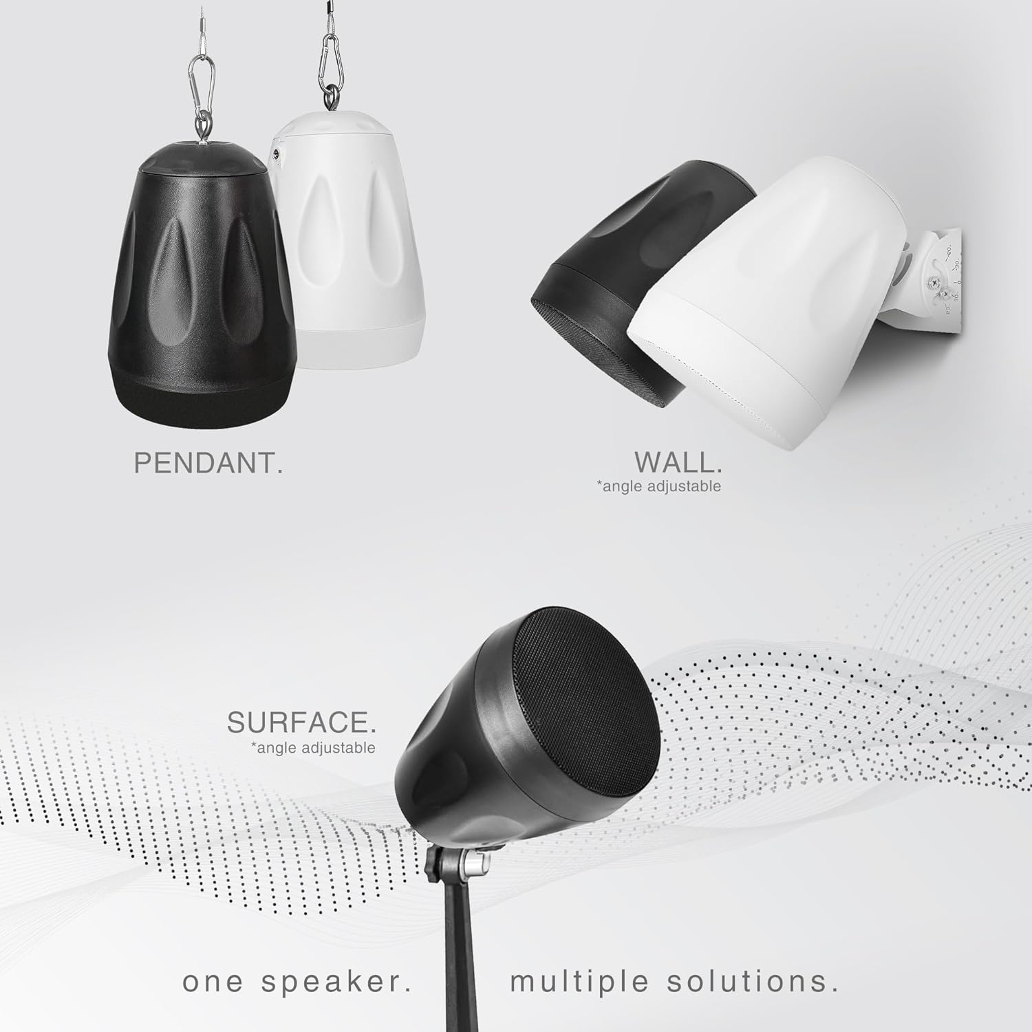 The STPDS-4W-PAIR white colored pendant speakers, four total included, are IP 66 weather-resistant, ideal for any environment. Each speaker is equipped with a 4″ woofer and a 1″ neodymium compression driver, offering balanced and dynamic sound. The installation versatility is a key feature – these speakers can be set up as pendant speakers, wall-mounted, or as landscape ground-mounts, with all necessary components included for your preferred setup.