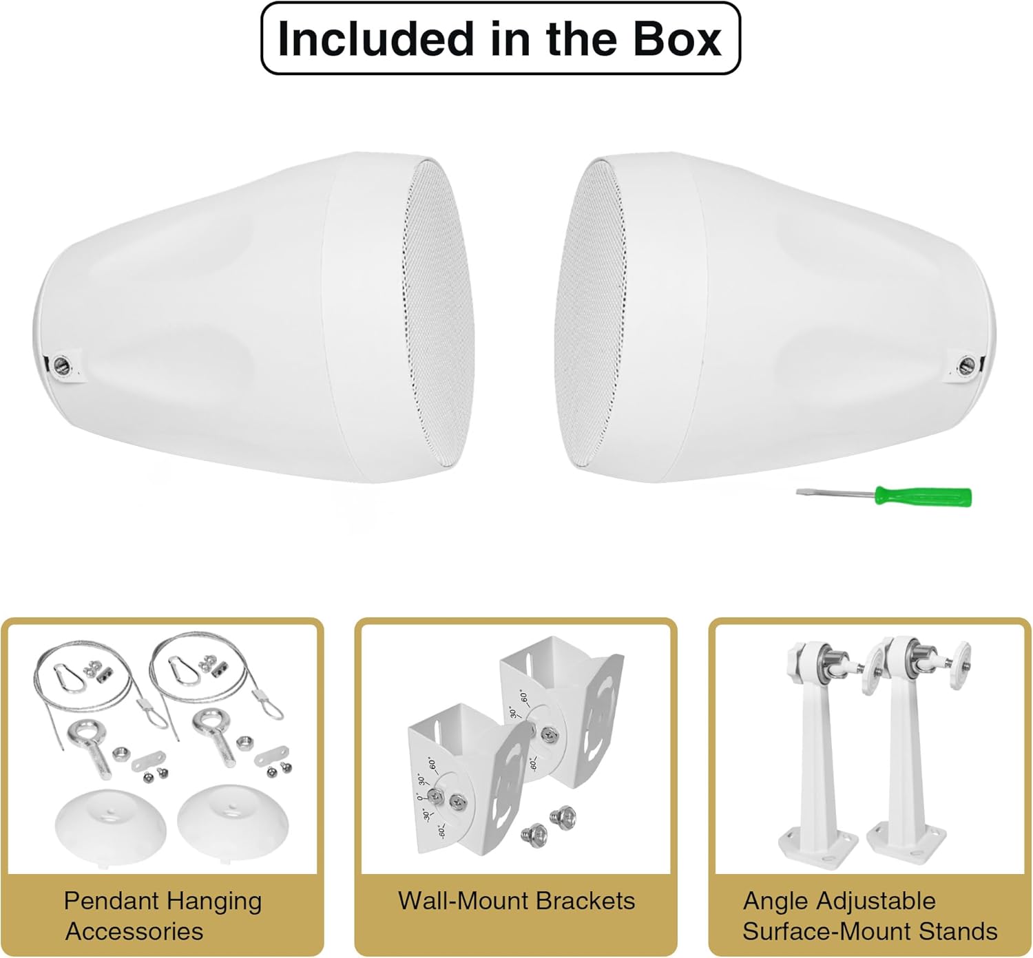 STPDS-4W IP 66 WEATHER-RESISTANT SPEAKERS: Includes (2) STPDS-4W-PAIR (4 in total) white colored IP 66 weather-resistant pendant speakers, each equipped with 4“ woofer and a coaxial 1” neodymium compression driver. Install the speakers as pendant speakers, wall-mounted, or landscape ground-mount setups that suit your setup (3 types of installation components included in the package)
