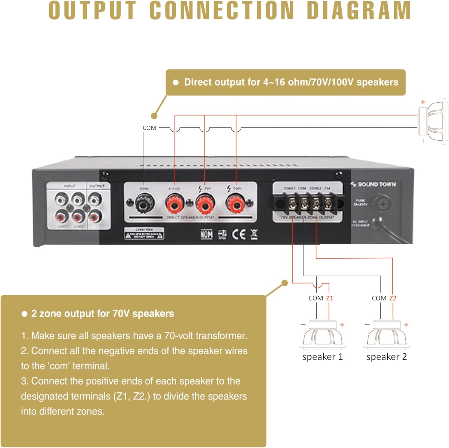 PAC80-2 POWER AMPLIFIER: The Sound Town PAC80-2 amplifier works with 70V/100V or 4~16 ohm low impedance speakers, delivering 60W of power output. It supports Bluetooth and offers 2 zones with individual volume controls. Built-in clipping limiter protects your speakers and amp from overheating
