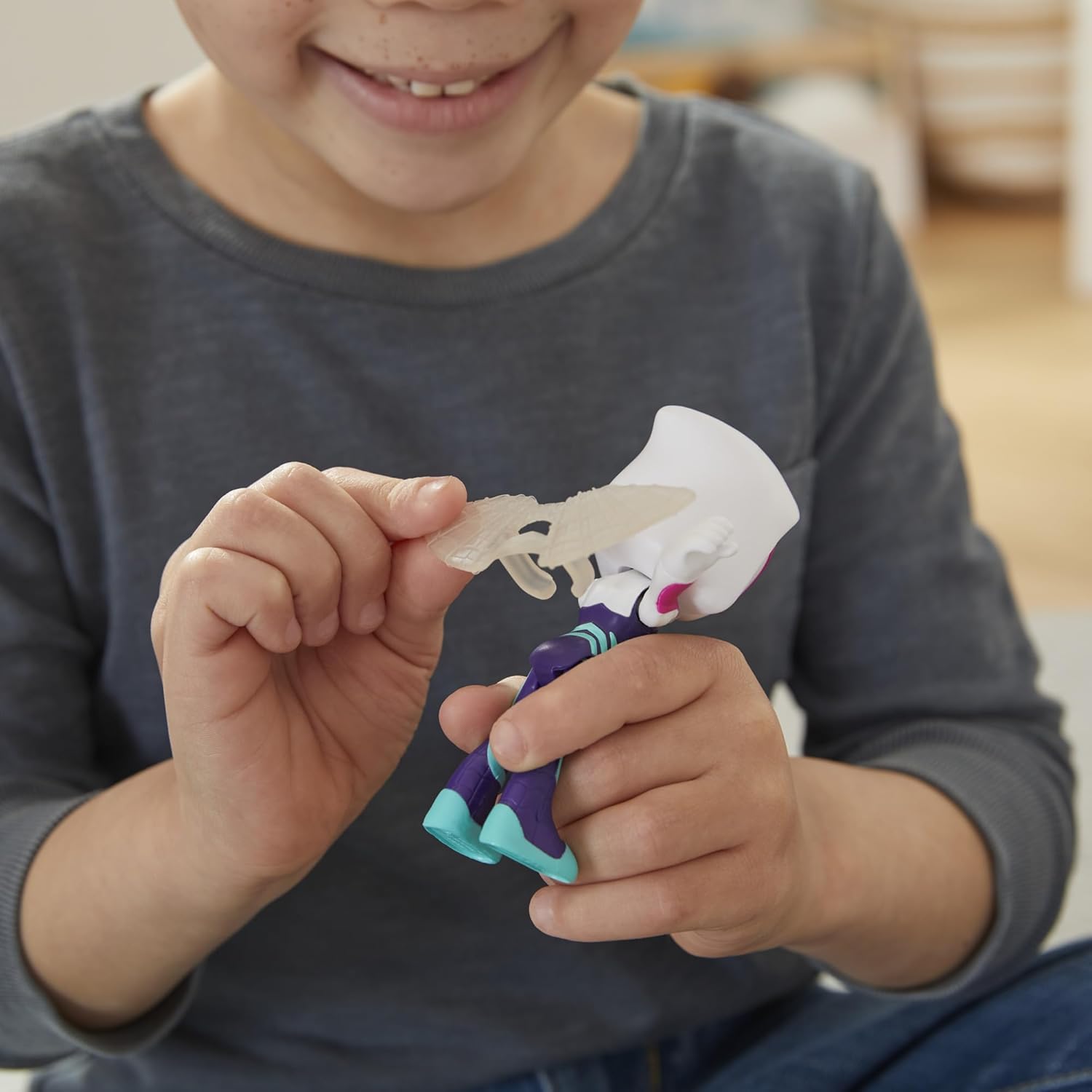 3 ACCESSORIES, ATTACHABLE TO FIGURES: Each figure includes a character-specific web accessory; clip Spidey’s web to his wrist or Ghost-Spider’s web wings onto her back