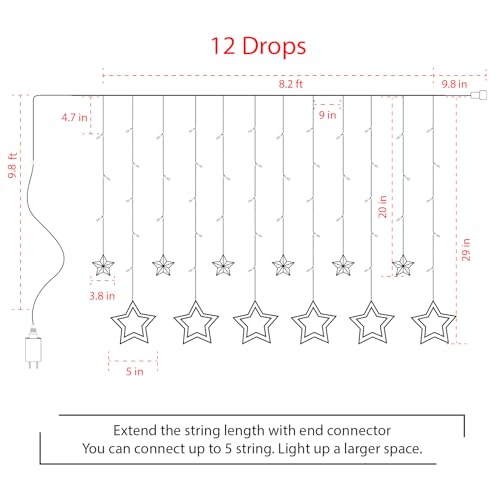 【 Christmas Star Lights with 12 Star Drops 】- The star curtain lights are 9 feet long with 12 drops of cute star-shaped bulbs that make an adorable addition to your porch or outdoor living space. 138 LED bulbs make up the 12 drops ( 6 big stars of 5”and 6 small stars of 3.8”), each of which is roughly 9 inches wide.