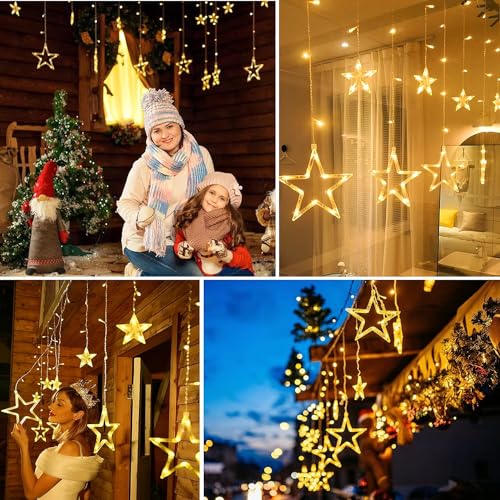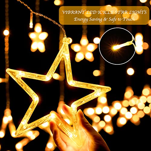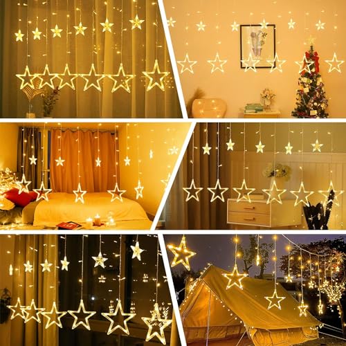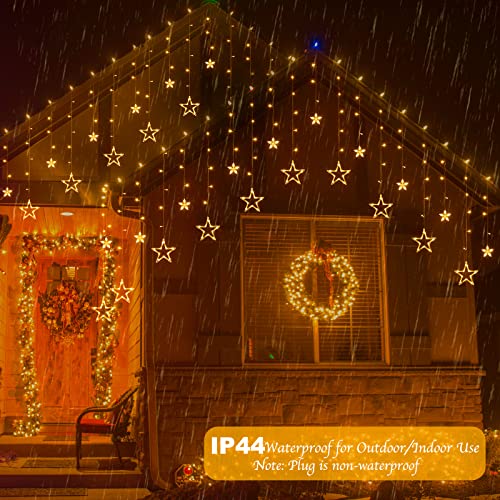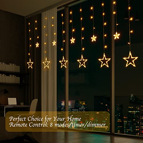 Star Curtain Lights for Bedroom – Plug-in 9ft 138 LED Fairy Twinkle Lights with 12 Star Drops, Connectable Window Lights with Remote 8 Lighting Modes for Indoor Xmas Ramadan Decoration, Warm White