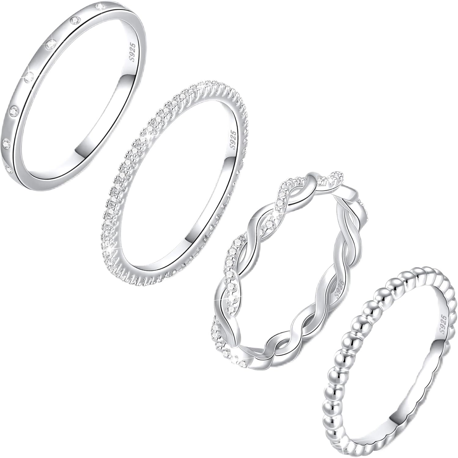 Sterling Silver Ring for Women, 4PCS Thin Stackable Rings Cubic Zirconia Thumb Ring Set Engagement Statement Wedding Bands for Women Size 5-10