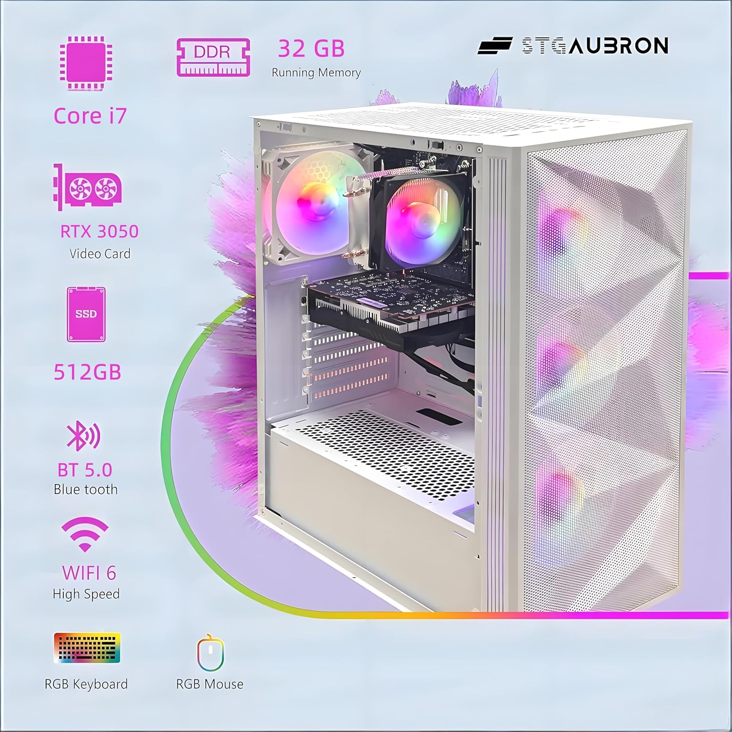 STGAubron Gaming PC Desktop Computer, Intel Core i7 up to 3.9G, GeForce RTX 3050 6G, 32GB RAM, 512GB SSD, WiFi 6, BT 5.0, RGB Fan x 4, Windows 11 Home, White
