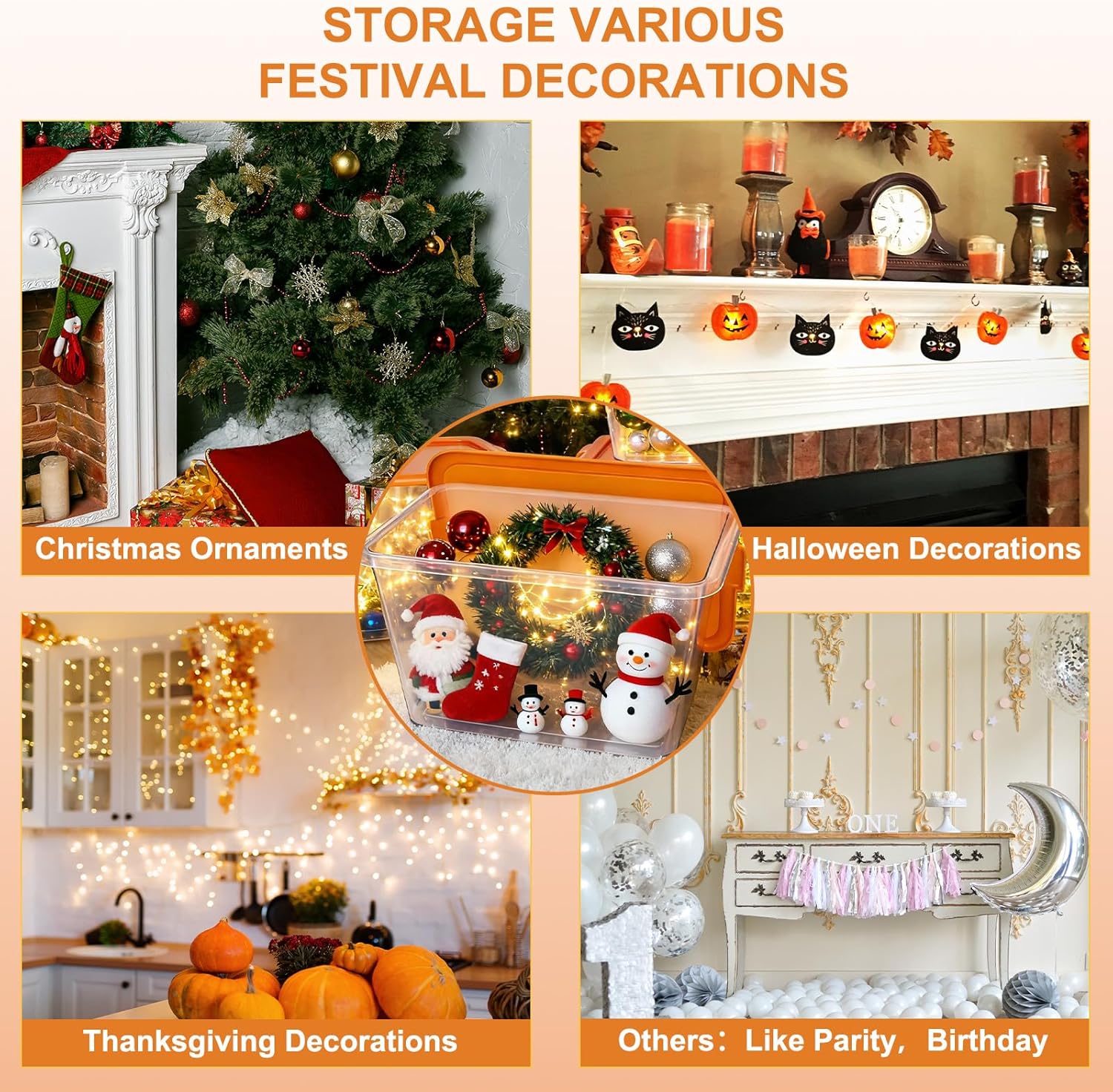 1 Christmas Totes 2 Halloween Totes 3 Thanksgiving Totes 4 Birthday Storage Bin 5 Party Decoration Bin