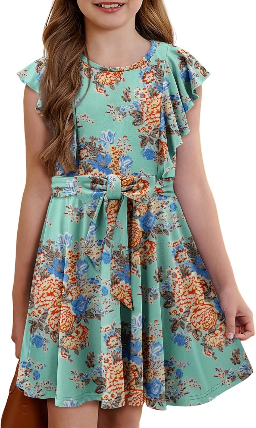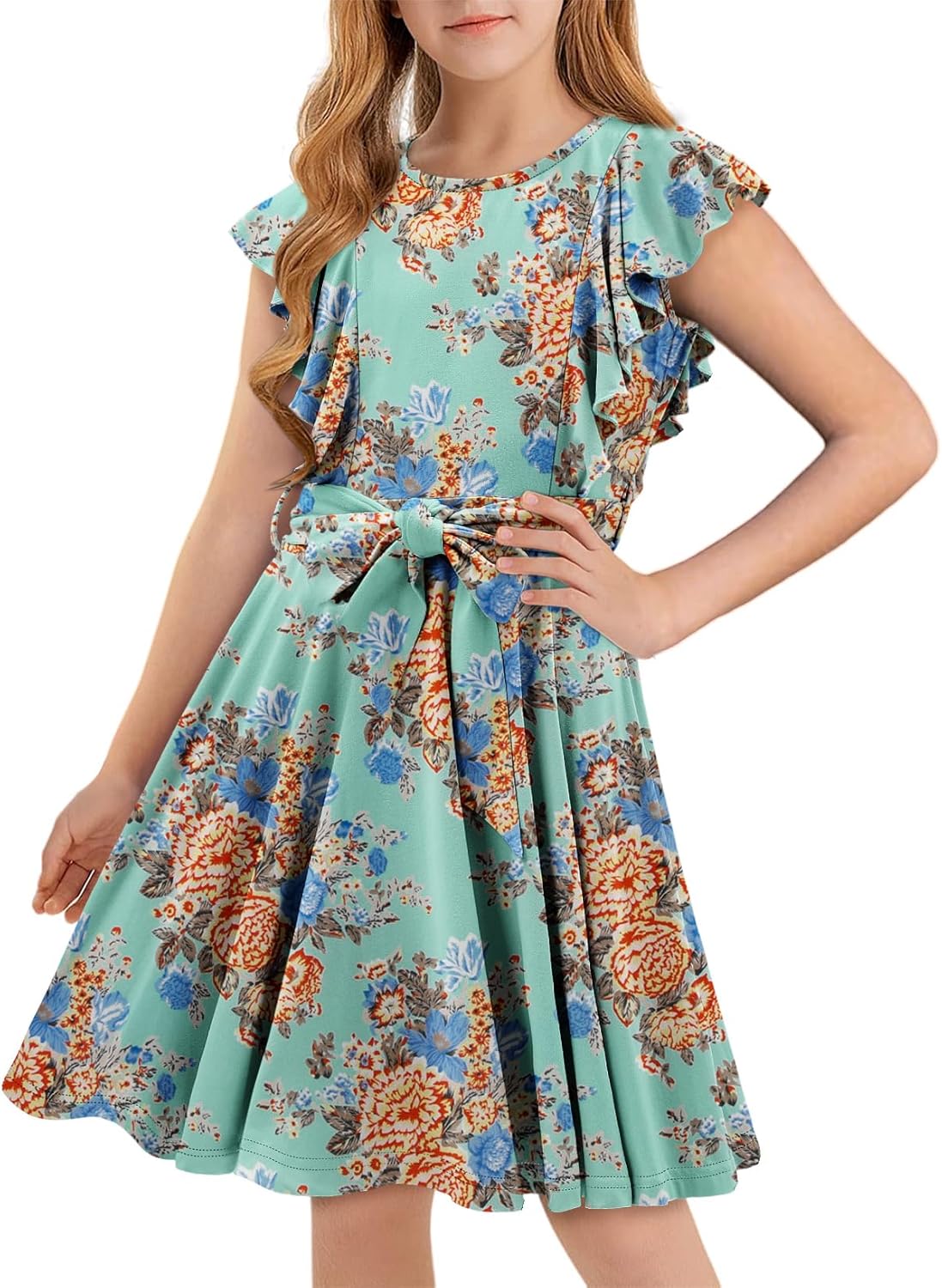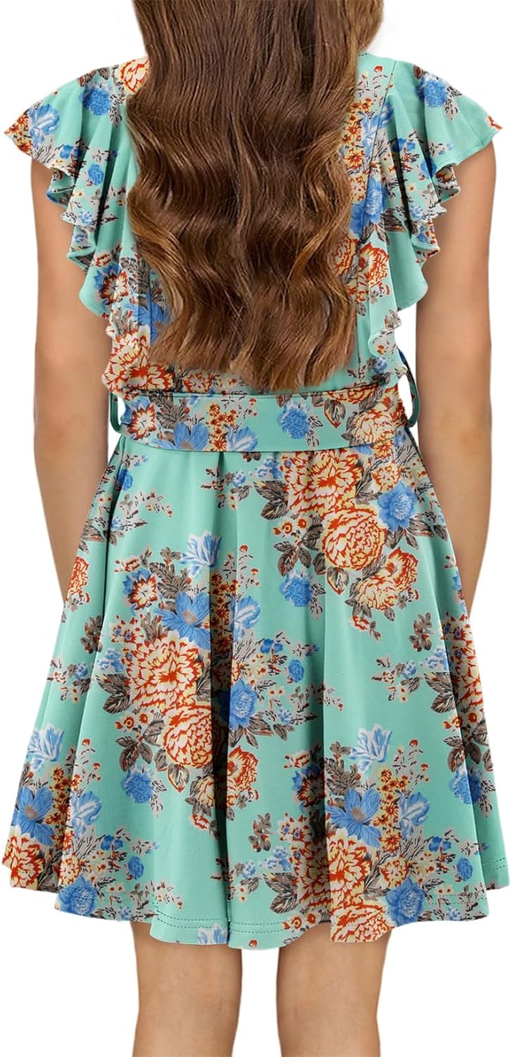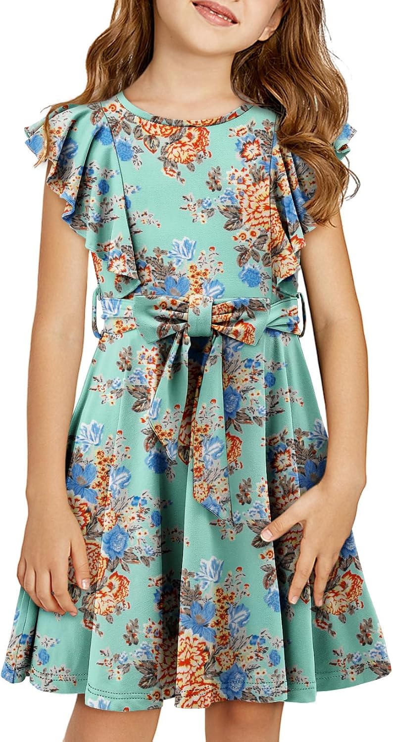 storeofbaby Girls Casual Ruffle Dress Elegant A-Line Flowy Dresses with Belt 5-14 Years