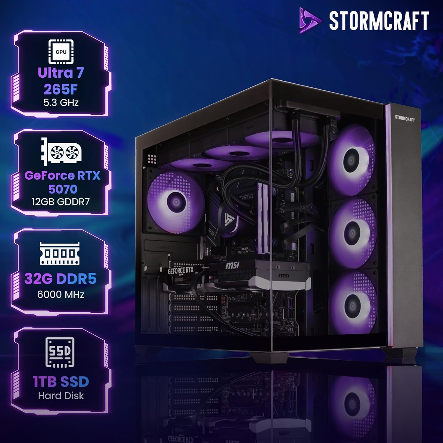 STORMCRAFT Falcon AI Gaming PC Desktop Intel Core Ultra 7 265F 5.3 GHz,Geforce RTX 5070,32GB DDR5 RGB Memory 6000MHz,1TB NVME SSD,360 AIO Cooler,B860 Chipset,850w Gold PSU,WiFi,BT,USB-C Computers