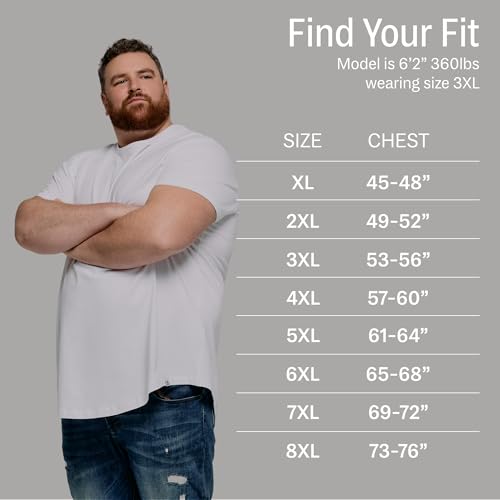 PERFECT FIT FOR BIG AND TALL. Exclusively designed in sizes XL-8XL, our big and tall men’s 8XL t-shirts contour perfectly around the arms, shoulders and chest while providing extra room in the mid-section. Specifically designed for bigger guys to fit their body type with comfort and style.