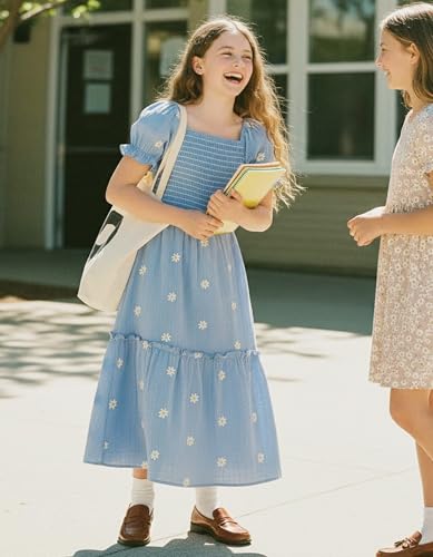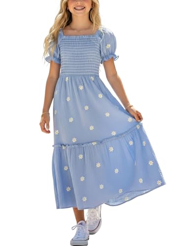 Boho-Chic Design with Floral Embroidery: This girls’ boho dress captures a free-spirited, trendy look with its 100% cotton fabric and delicate daisy embroidery. Featuring a tiered bottom, smocked bodice and square neckline, this girl maxi dress adds a touch of bohemian charm to your girl’s essential wardrobe. Ideal for both little and big girls who love fun and elegant styles