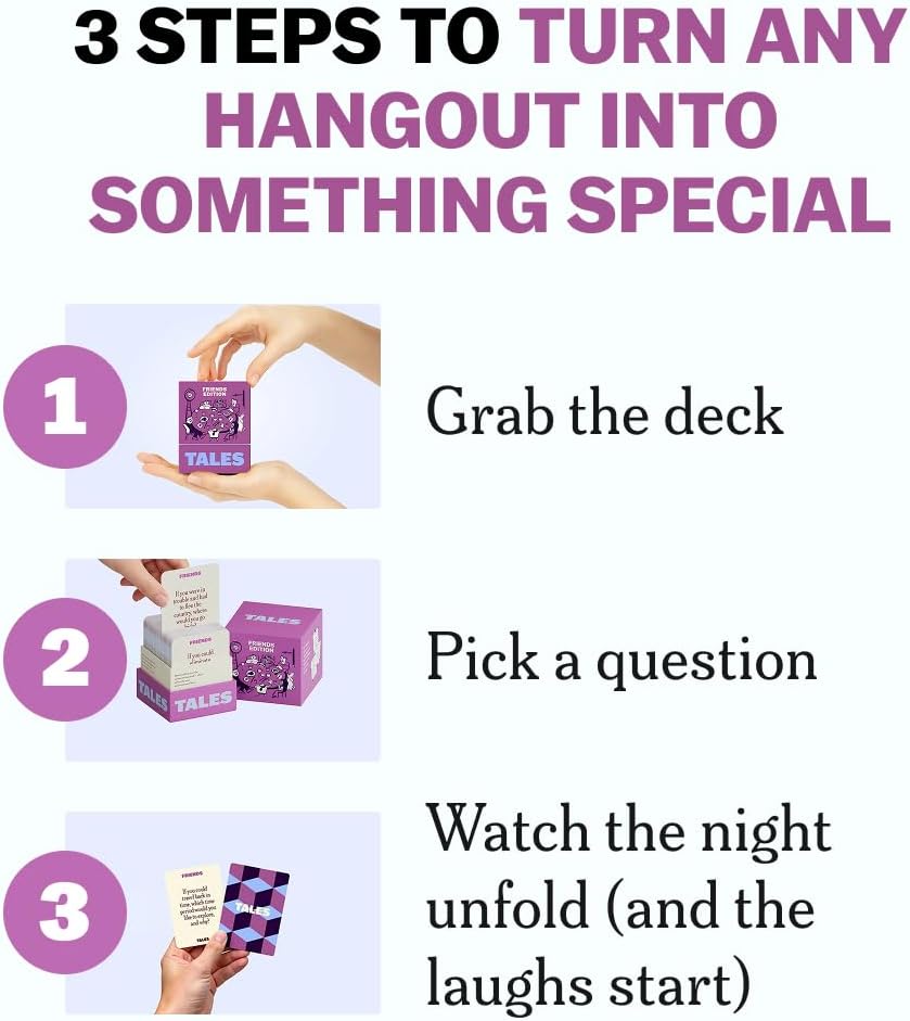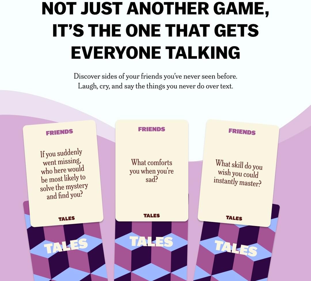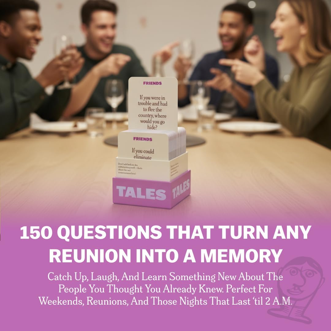 SPECIALLY CURATED DECK OF CARDS: The Tales friends edition game includes lighthearted, creative, and thoughtful questions designed to inspire deeper connection among friends of all ages. Whether you’ve known each other for years or are just getting closer, each prompt is crafted to help you discover new things, reminisce on favorite memories, and encourage authentic conversations.