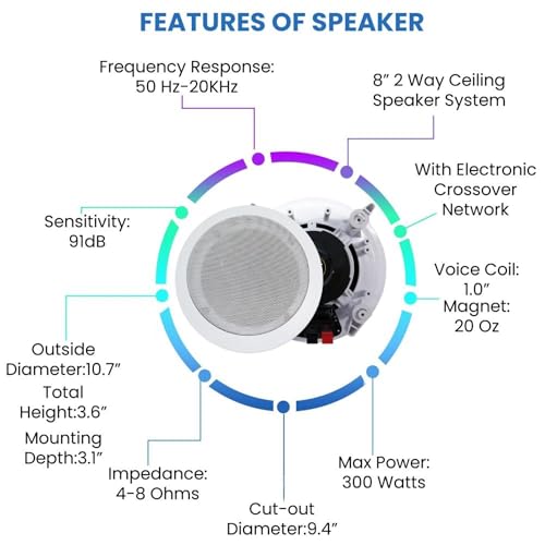 Powerful 8” Ceiling Speakers : Each in-ceiling speaker handles up to 300W with a rotatable 1” titanium dome tweeter and black injection cone, delivering rich mid-bass and high-frequency performance. Designed for immersive sound in home theaters or restaurants.