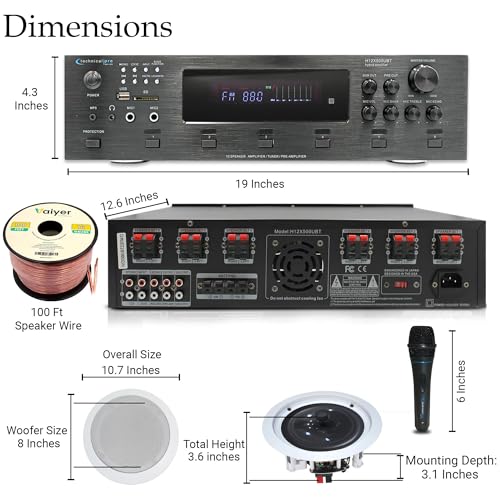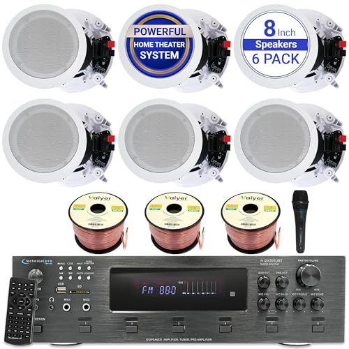 Technical Pro in Ceiling Speakers Kit – 6X 8” 300W Flush Mount Speakers, 6000W Bluetooth Amplifier, Mic & 300ft Wire – Home Theater Ceiling Speaker System for Home, Office, Bar & Restaurant