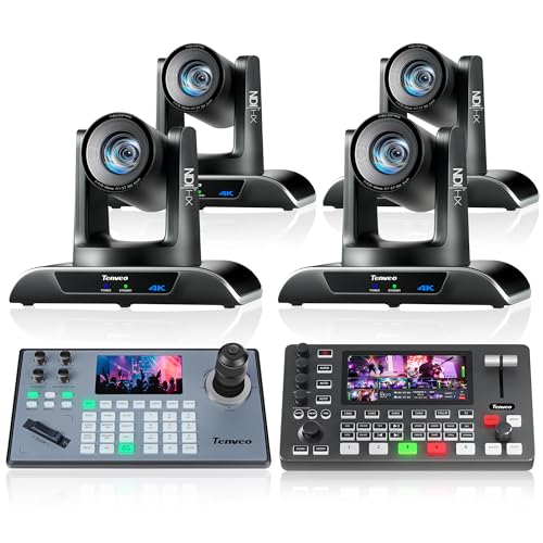 Tenveo PTZ Camera Bundle/Kits -20X 4K NDI AI Auto-Tracking PTZ Camera(4pcs) with HDMI/USB3.0/LAN(PoE), NDI PTZ Joystick Controller and 4K HDMI + SDI Video Switcher Mixer for Live Production Events