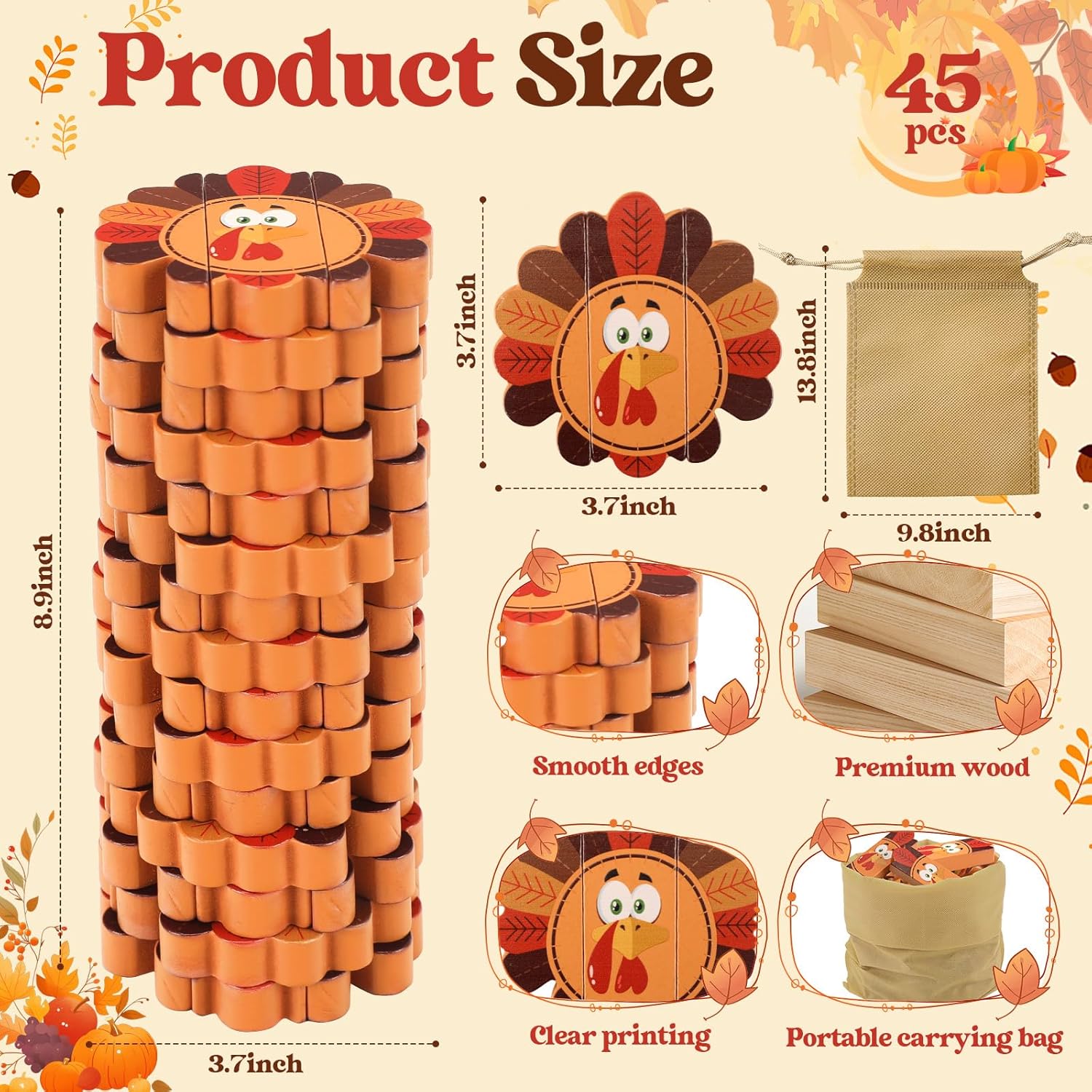 【Thanksgiving-Themed Design】This Thanksgiving Wooden Blocks Stacking Game includes 45 Turkey-shaped wooden pieces. Each block measures 3.8 inches in length and 0.6 inches in thickness. A beige storage bag is also provided for easy portability and neat storage.