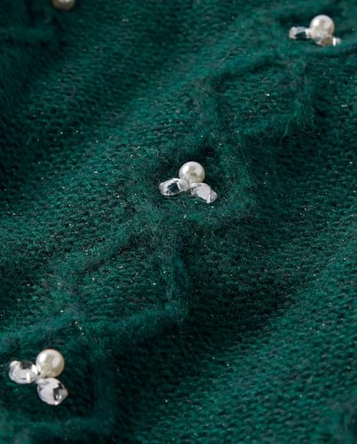 FEATURES: Super-soft hand feel, metallic threading, cable knit, rhinestones & faux pearls at bodice