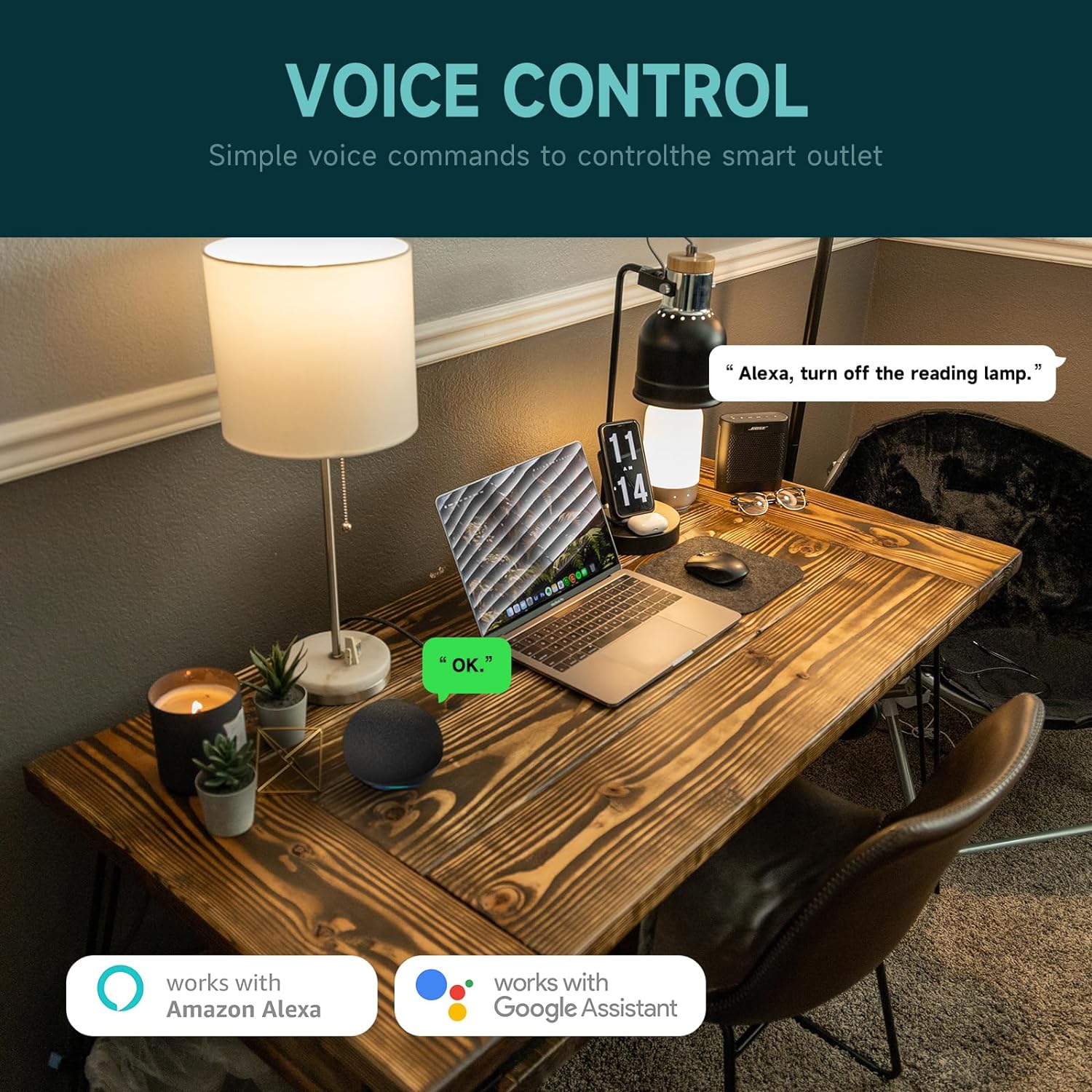 Voice Control: Smart Receptacles that work with Alexa and Google home to enable voice control of WIFI outlets, available through a simple voice