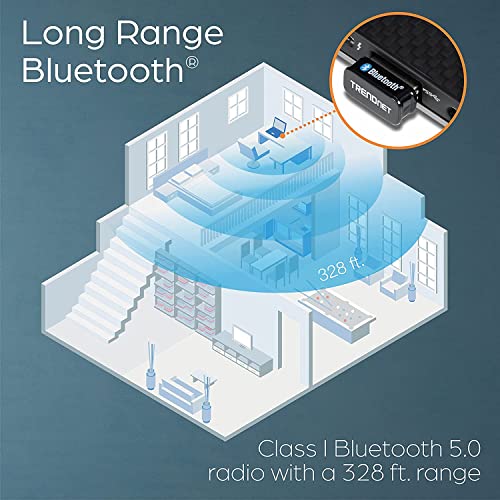 INCREASED RANGE: This USB 5.0 Bluetooth adapter increases your range by up to four times of Bluetooth 4.0. Reliable class 1 Bluetooth connectivity for distances up to 100m (328 ft.) with high-quality stereo audio support