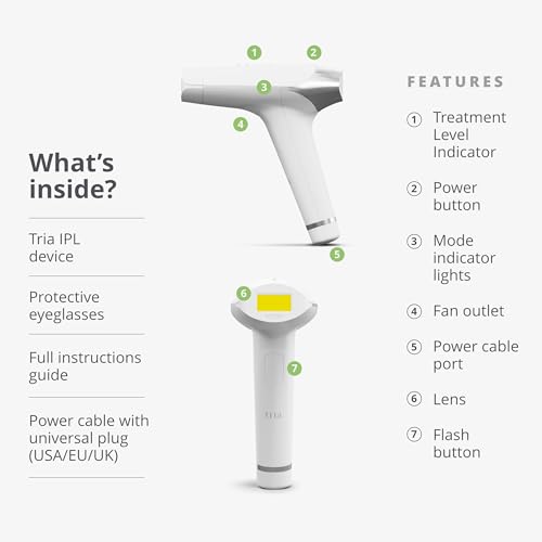 Complete Hair Removal Kit: Your purchase includes the Tria IPL Device, protective eyeglasses, an extensive instruction guide, and a versatile power cable