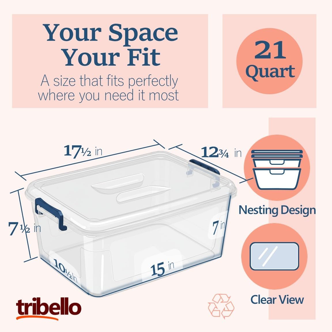 Specification: Tribello Clear Storage Bins with Lids, 12-Pack Stackable Plastic Storage Containers for Home Organization – Totes for Closet and Underbed Storage, 21 Quarts