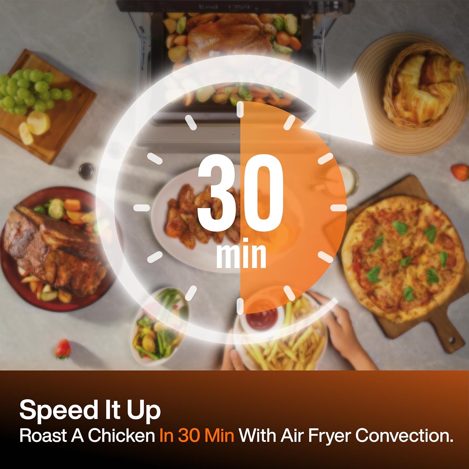 𝟑𝟔𝟎° 𝐓𝐮𝐫𝐛𝐨 𝐂𝐨𝐧𝐯𝐞𝐜𝐭𝐢𝐨𝐧 𝐒𝐲𝐬𝐭𝐞𝐦: Air fry wings, fries, or veggies with minimal oil for a golden, crispy exterior while keeping the inside tender and juicy. Dual heating elements and a 2400 RPM fan circulate heat in a full 360° for faster, more even cooking, roasting dishes up to 30% quicker than traditional ovens. Perfect for healthier, chef-quality results.